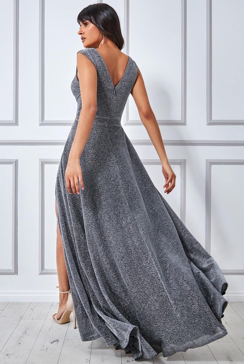 Abito lungo argento con spacco e scollo a cuore in lurex – Godiva England