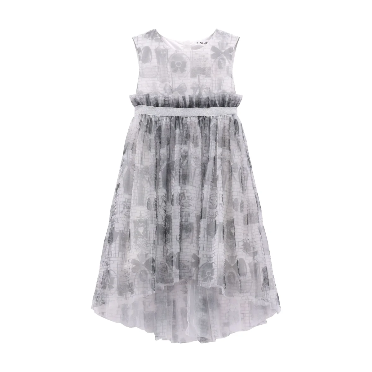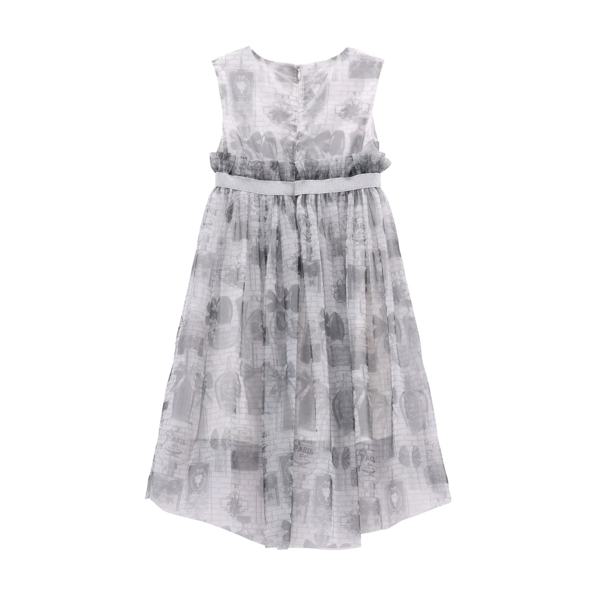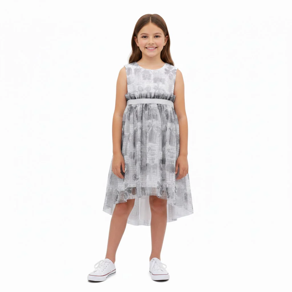 abito smanicato ragazza grigio con stampa all over e gonna in tulle โ vestito elegante in tessuto leggero con sovrapposizione in tulle stampato effetto romantico, impreziosito da fantasia grafica tono su tono e balza arricciata in vita con fascia elastica laminata. modello con linea ampia e fluida, fondo leggermente asimmetrico sul retro per un tocco raffinato, ideale per cerimonie ed occasioni speciali, perfetto da abbinare a ballerine o sandali per un look delicato e ricercato.
