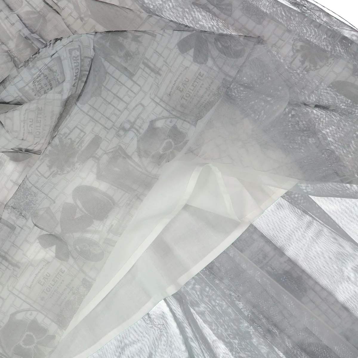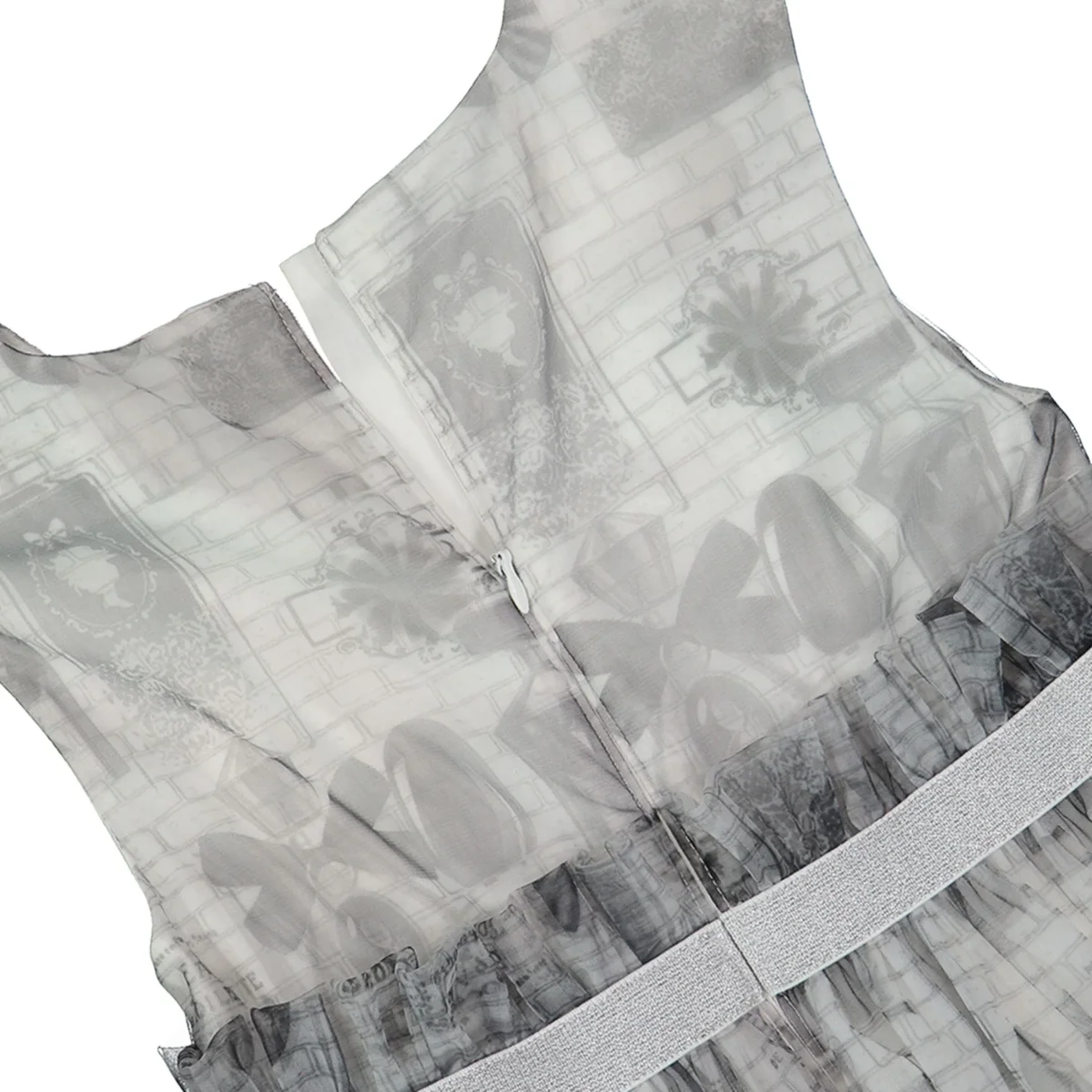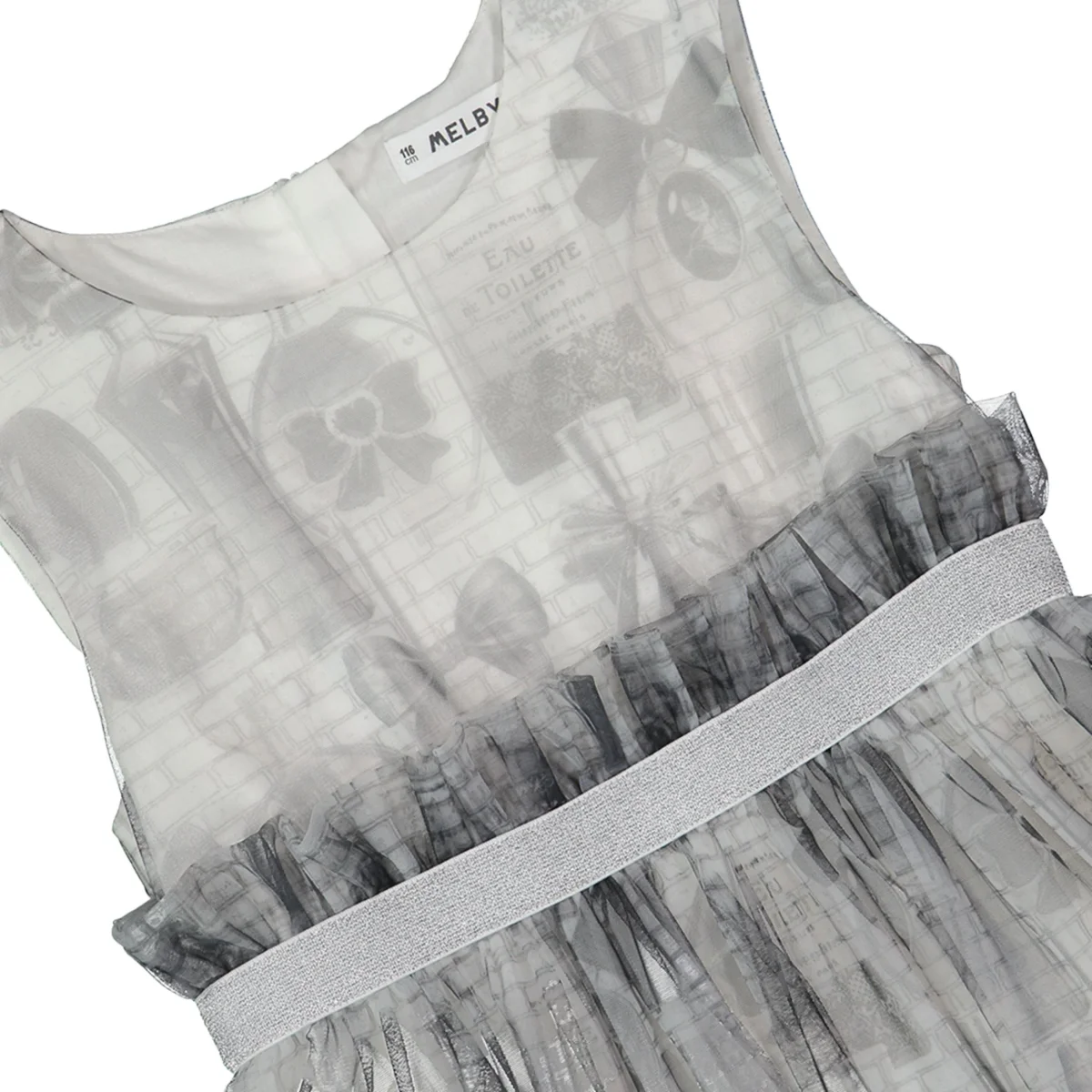 abito smanicato ragazza grigio con stampa all over e gonna in tulle โ vestito elegante in tessuto leggero con sovrapposizione in tulle stampato effetto romantico, impreziosito da fantasia grafica tono su tono e balza arricciata in vita con fascia elastica laminata. modello con linea ampia e fluida, fondo leggermente asimmetrico sul retro per un tocco raffinato, ideale per cerimonie ed occasioni speciali, perfetto da abbinare a ballerine o sandali per un look delicato e ricercato.