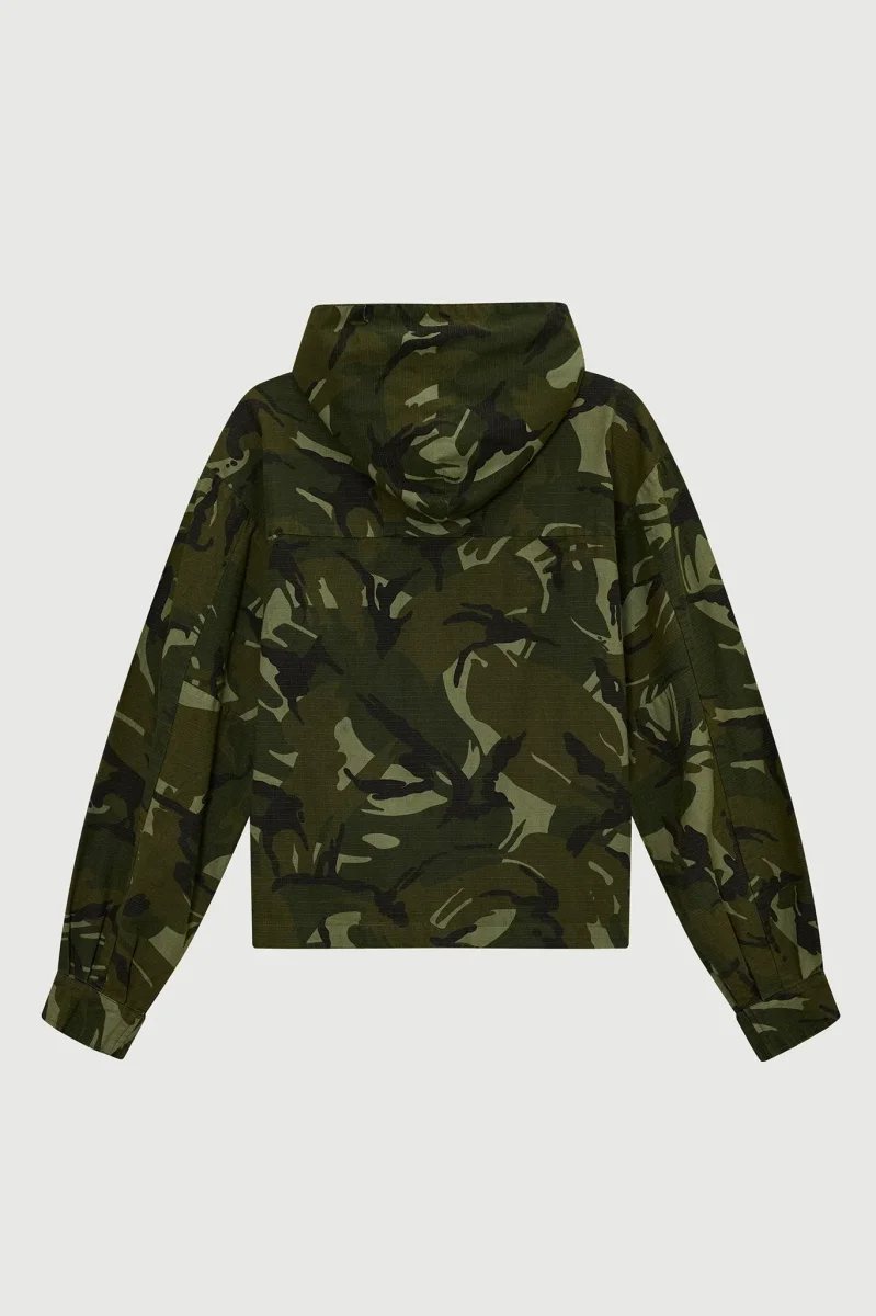 Questa giacca รจ un pezzo mimetico leggero con finitura lavata, chiusura con zip e vestibilitร rilassata, progettata per un look streetwear audace e urbano.
