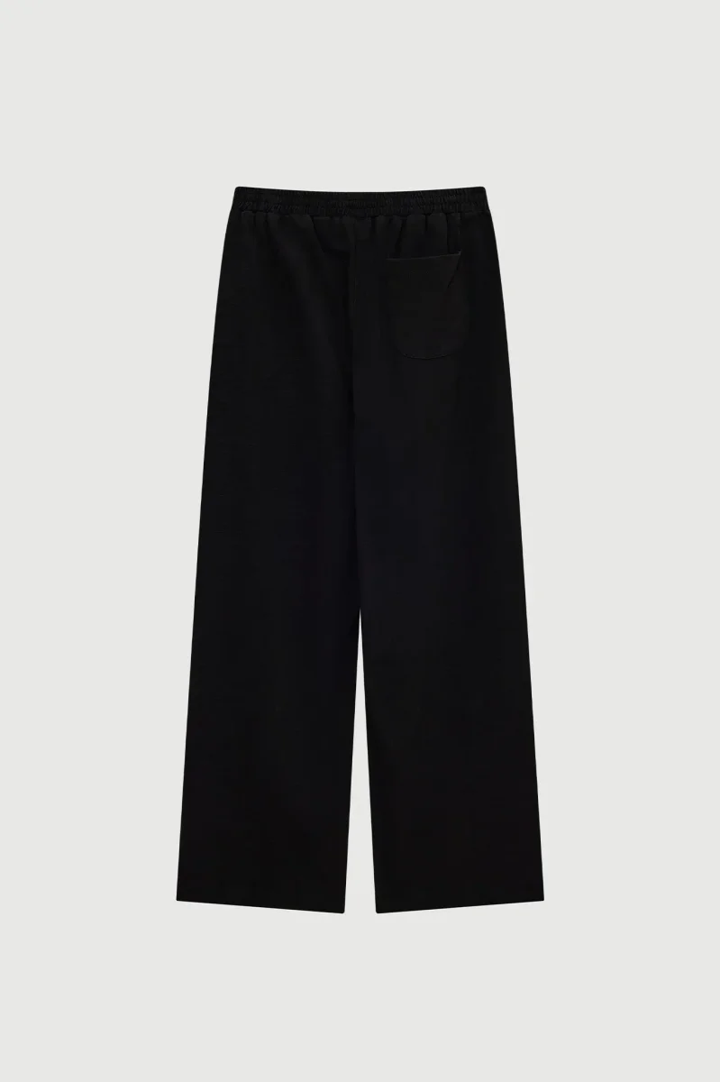Pantaloni in cotone nero con una trama ricca e irregolare e un carattere di superficie grezza. Un essenziale in forma rilassata.