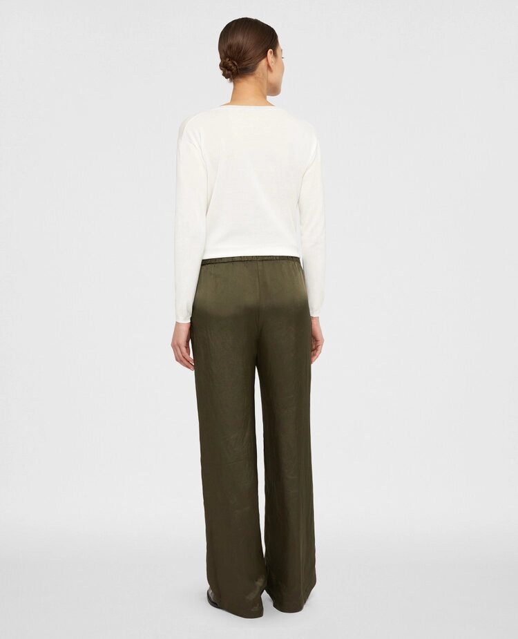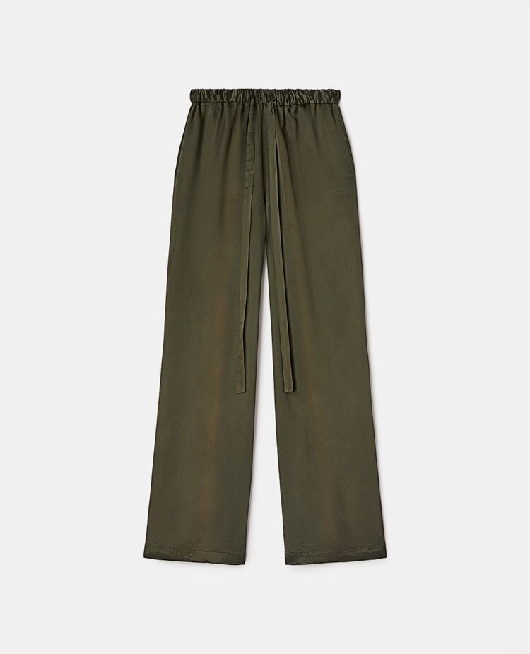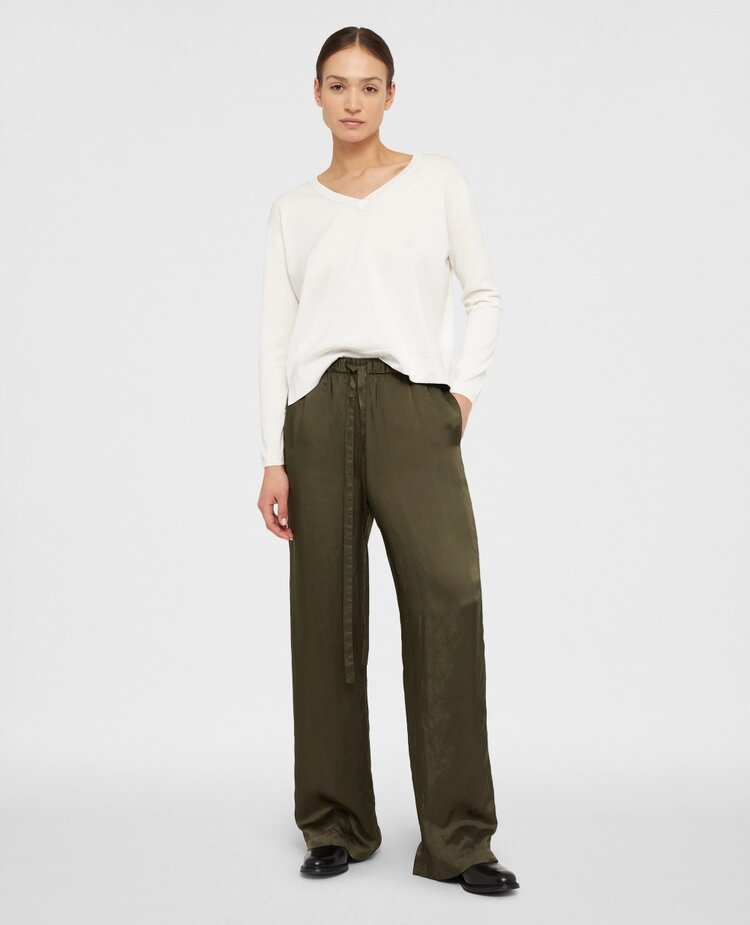 Pantalone in viscosa lavata, tessuto che unisce la resistenza e la freschezza del cotone alla morbidezza e alla brillantezza della seta. Il capo si presenta leggero e lucente, con pratico elastico e coulisse in vita. La vestibilitร  รจ regolare, con vita media e gamba ampia e dritta, mentre le tasche all’americana lungo i fianchi ne aumentano la funzionalitร . La modella รจ alta 176cm e indossa la taglia 40 (IT)