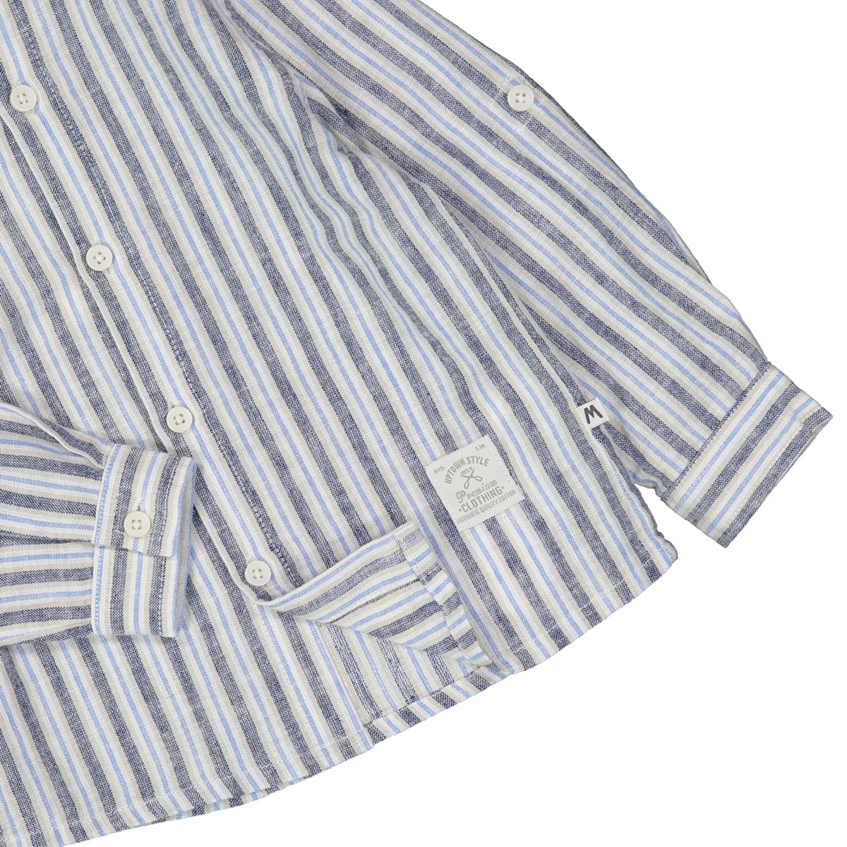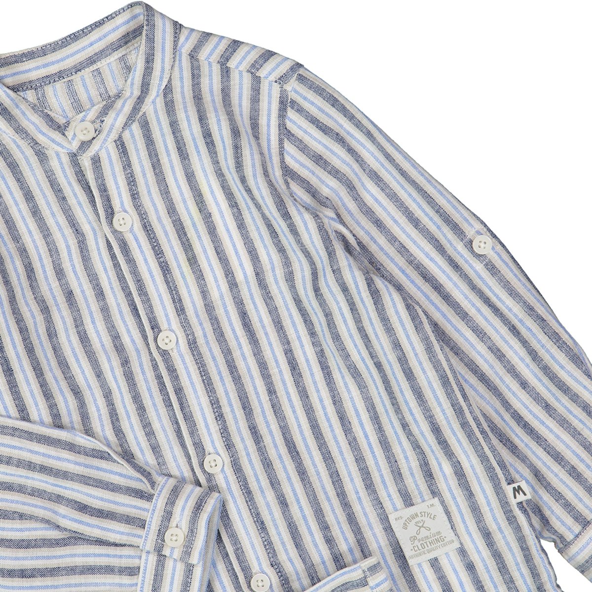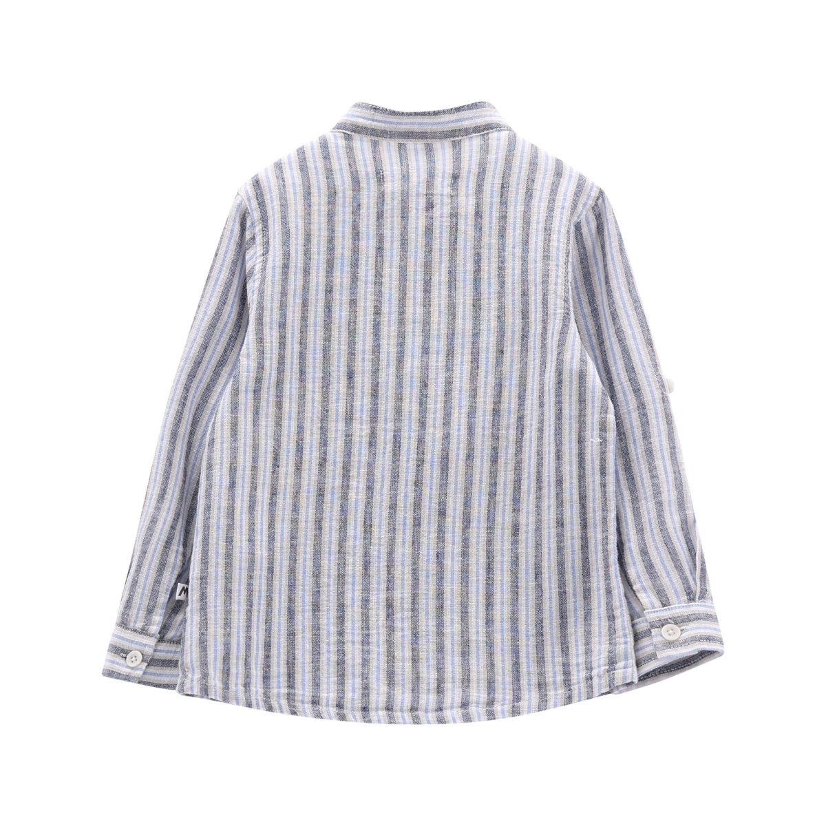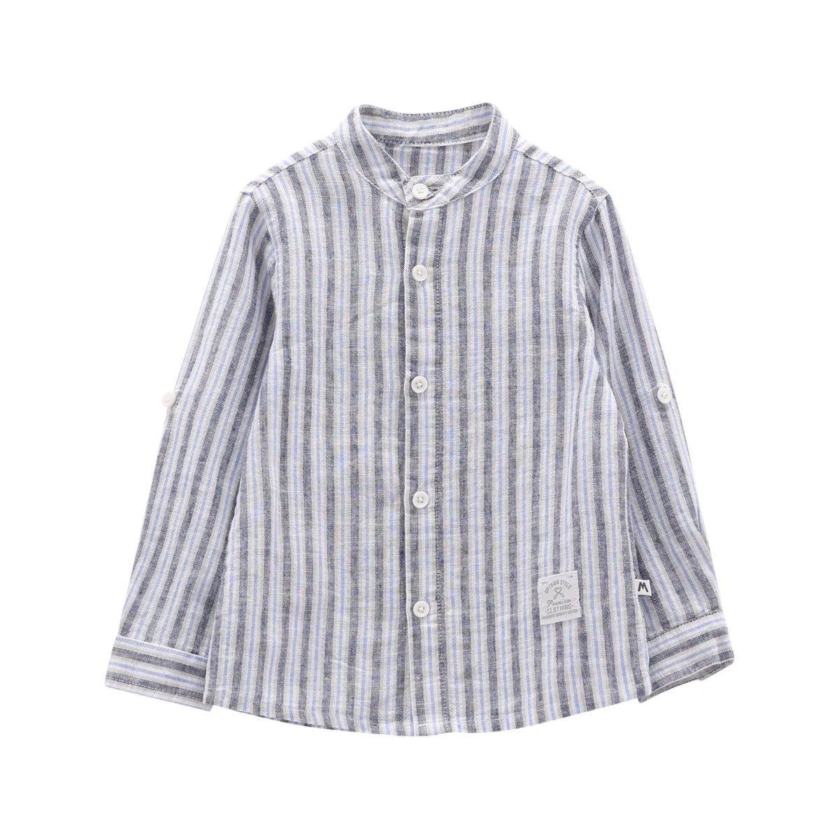 camicia bambino rigata azzurro e beige con collo coreano โ camicia in tessuto leggero effetto lino con fantasia a righe verticali nei toni dellโazzurro, beige e grigio, dal look fresco e raffinato. modello con abbottonatura frontale, collo coreano e maniche lunghe risvoltate con bottone, ideale per creare outfit eleganti ma comodi. perfetta da abbinare a bermuda o pantaloni in cotone per cerimonie estive o occasioni speciali.