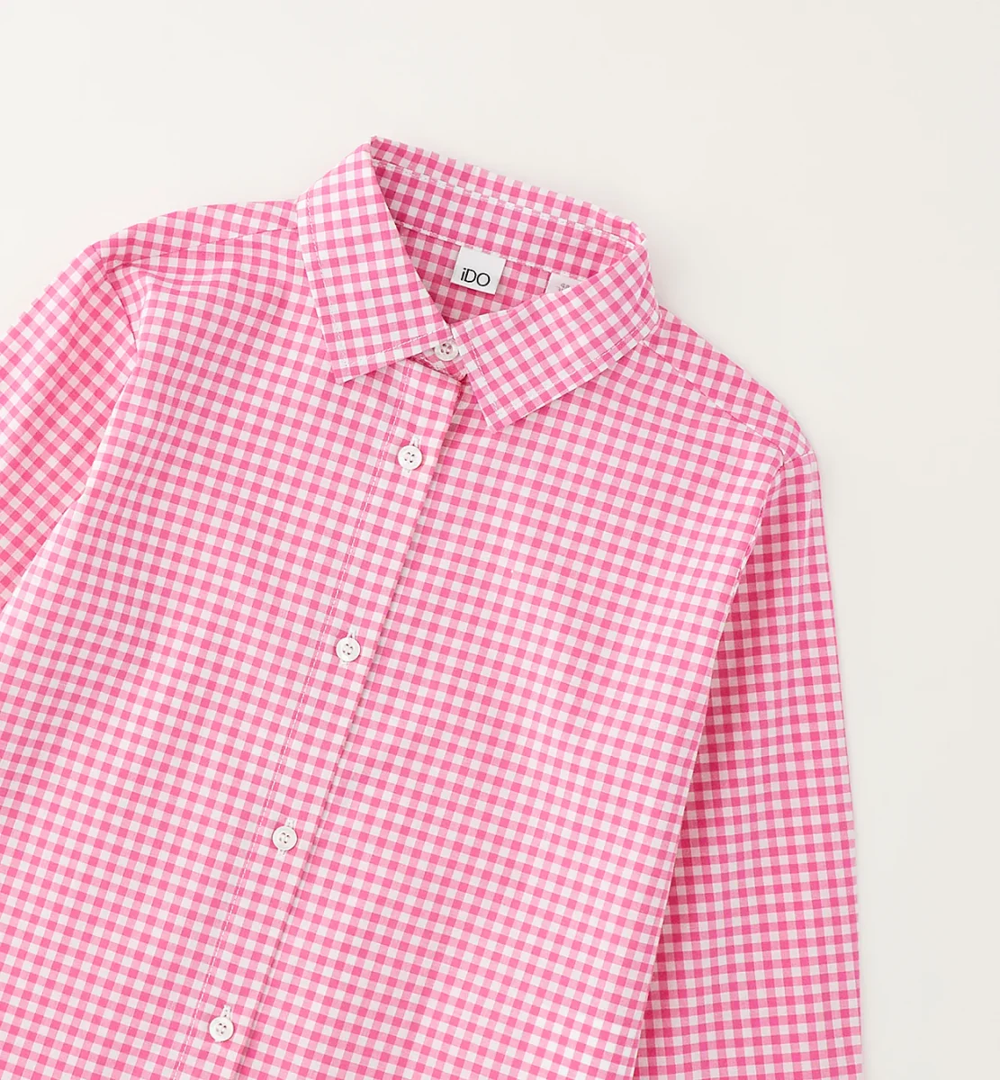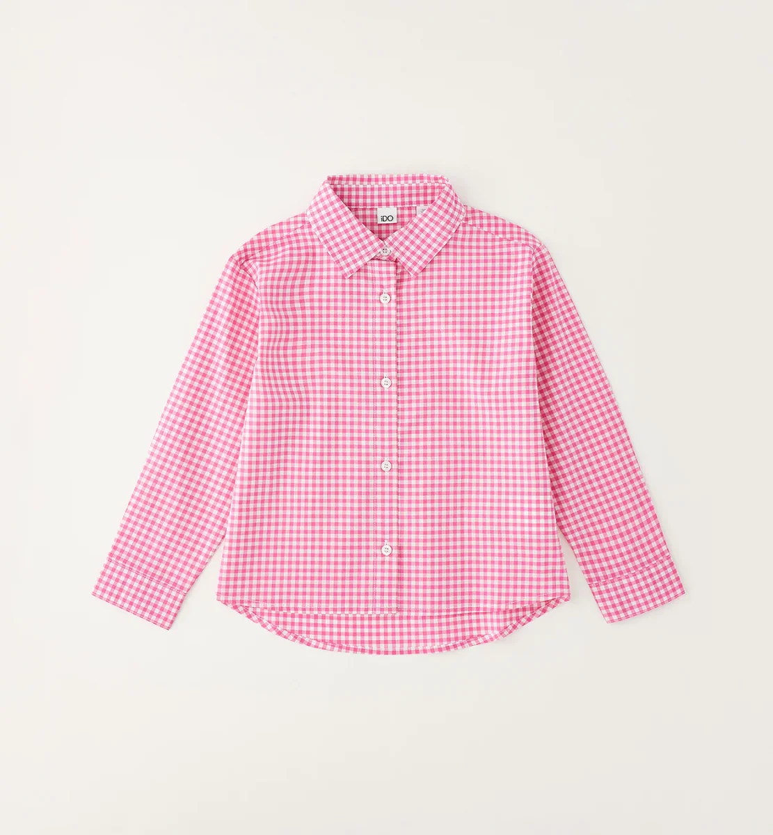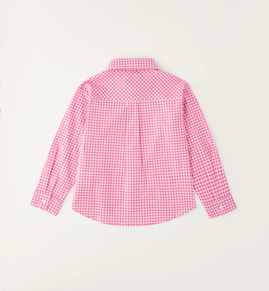 camicia manica lunga bambina quadretti rosa โ camicia in cotone leggero a fantasia vichy rosa e bianco con colletto classico e chiusura frontale a bottoni. modello dalla linea fresca e confortevole con fondo leggermente stondato, ideale per look casual o piรน curati, perfetta da abbinare a jeans, leggings o gonne per la mezza stagione.