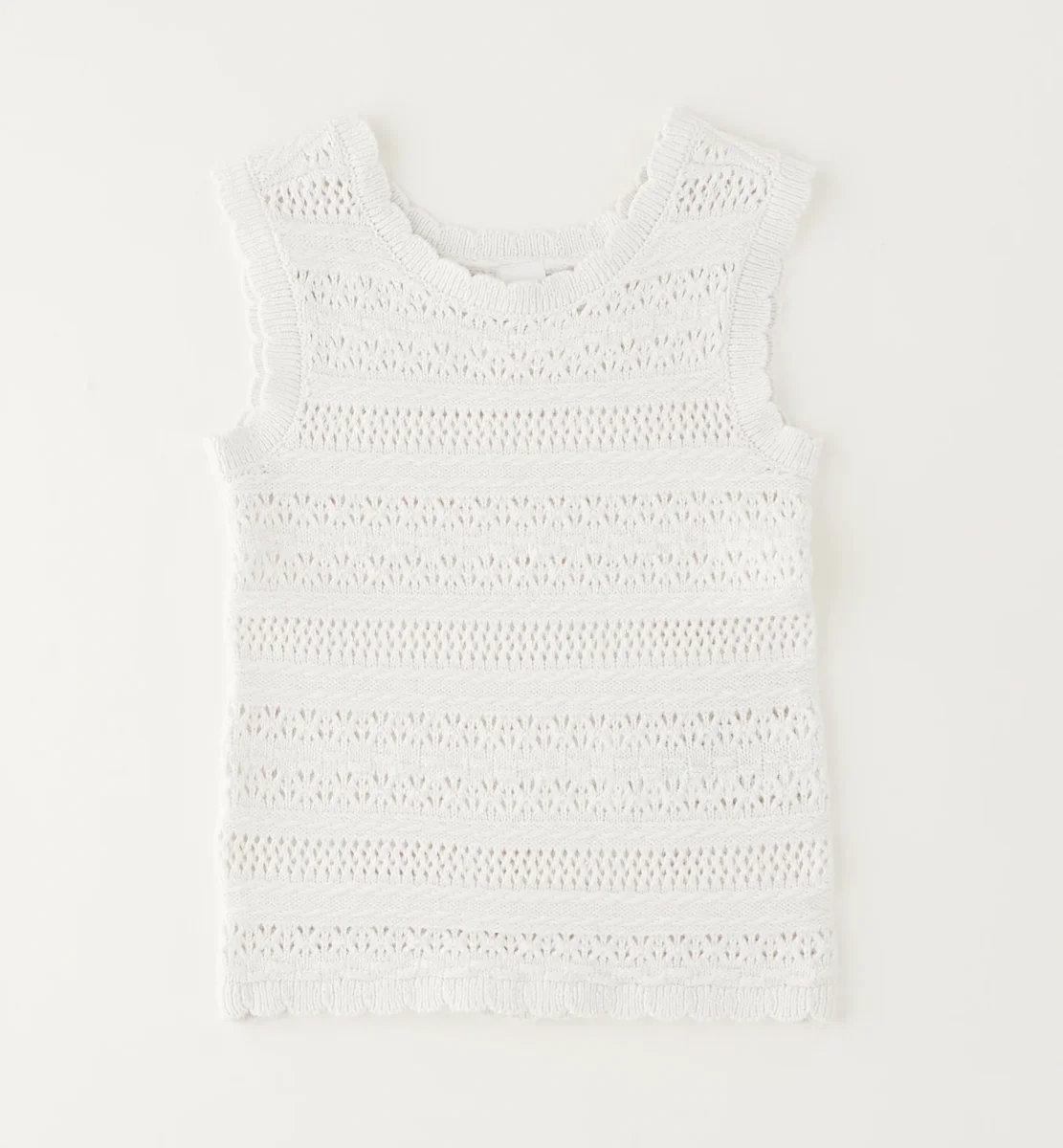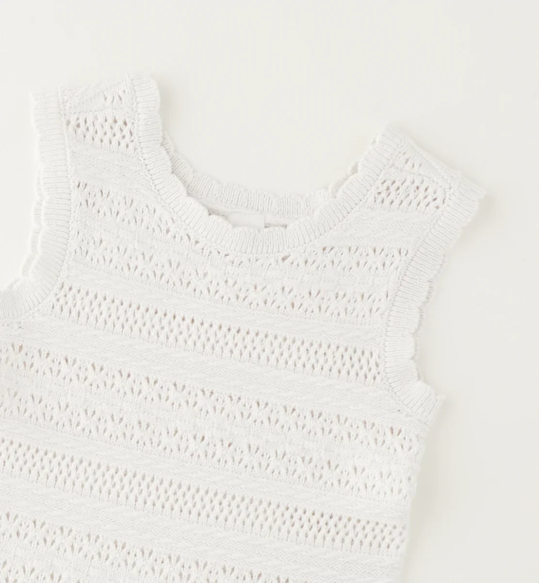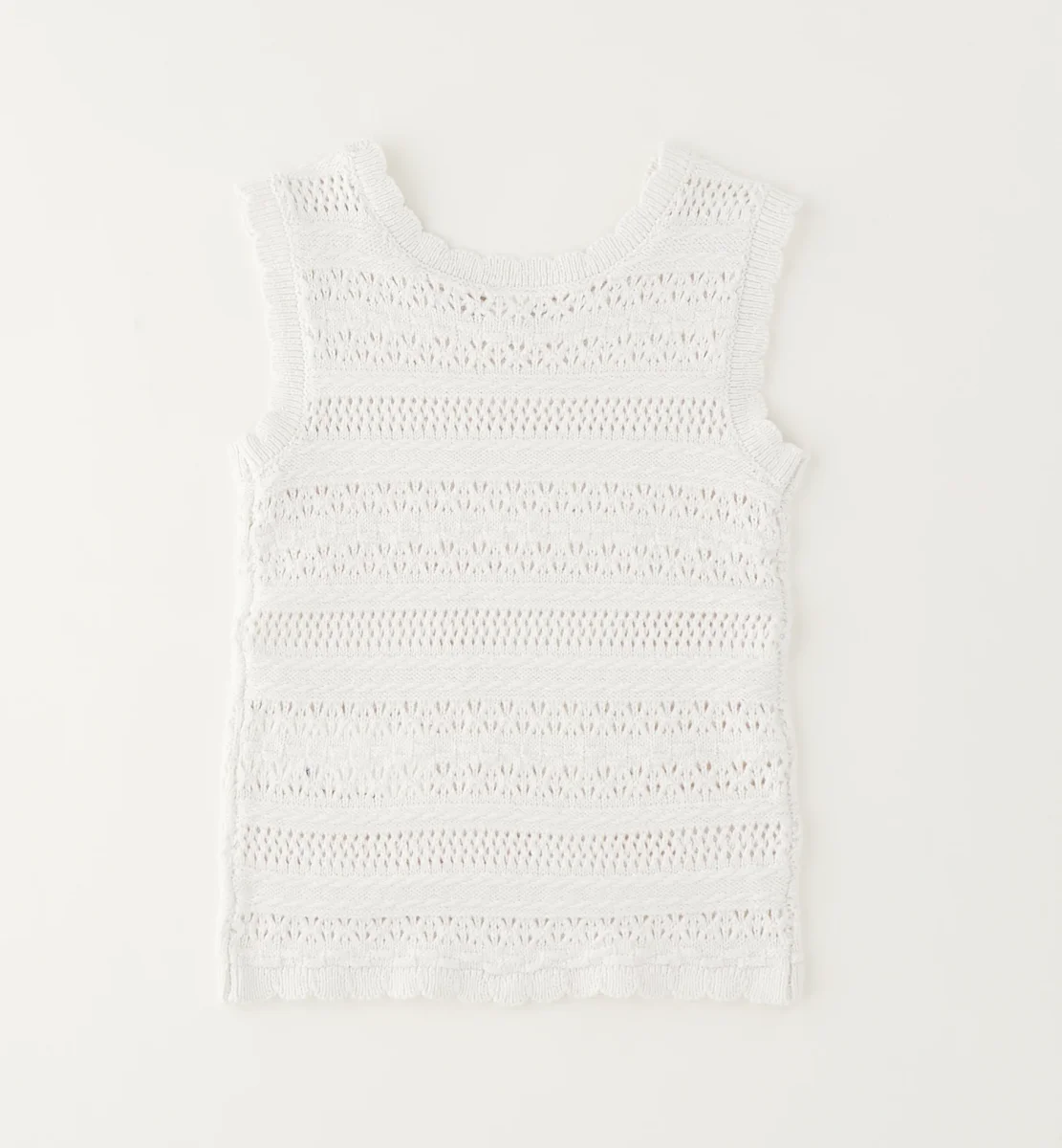 canotta bambina panna in maglia traforata con rouches โ€“ canotta in morbida maglia color panna lavorata con delicato motivo traforato a righe che dona leggerezza e raffinatezza al capo. modello smanicato con romantiche rouches lungo le spalle e scollo tondo rifinito a costine, per un effetto elegante ma naturale. linea dritta e vestibilitร  confortevole, perfetta da indossare sopra una t-shirt nelle mezze stagioni o da sola nei periodi piรน caldi. ideale da abbinare a shorts, gonne o jeans per creare outfit freschi e curati, adatti sia alle occasioni speciali che al tempo libero.