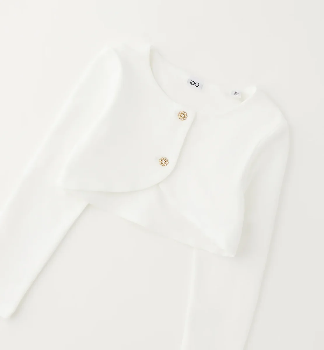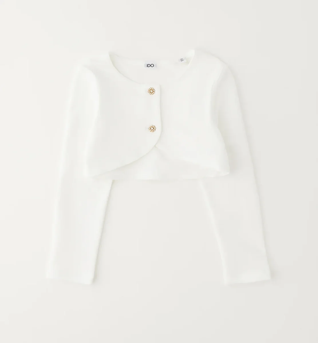 cardigan corto bambina bianco con bottoni gioiello โ bolerino elegante in tessuto morbido e compatto, pensato per completare outfit cerimonia o occasioni speciali con un tocco raffinato. modello a manica lunga con linea pulita e chiusura frontale impreziosita da bottoni decorativi luminosi, ideale da indossare sopra abiti eleganti o completini per comunioni, feste e ricorrenze, perfetto anche per spezzare look piรน semplici con stile delicato.