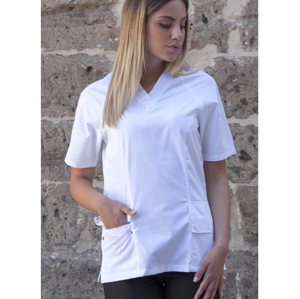 Casacca donna antimacchia con maniche corte e due tsche laterali.