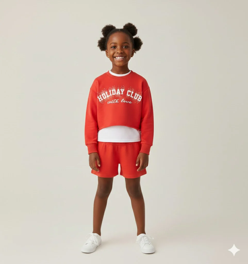 completo 3 pezzi bambina rosso con felpa crop e shorts โ€“ set coordinato dallo stile vivace e moderno composto da felpa corta con stampa lettering โ€œholiday club with loveโ€, t-shirt bianca con grafica cagnolino e scritta frontale e shorts rossi con vita elasticizzata. realizzato in morbido cotone, offre comfort e libertร  di movimento per il […]