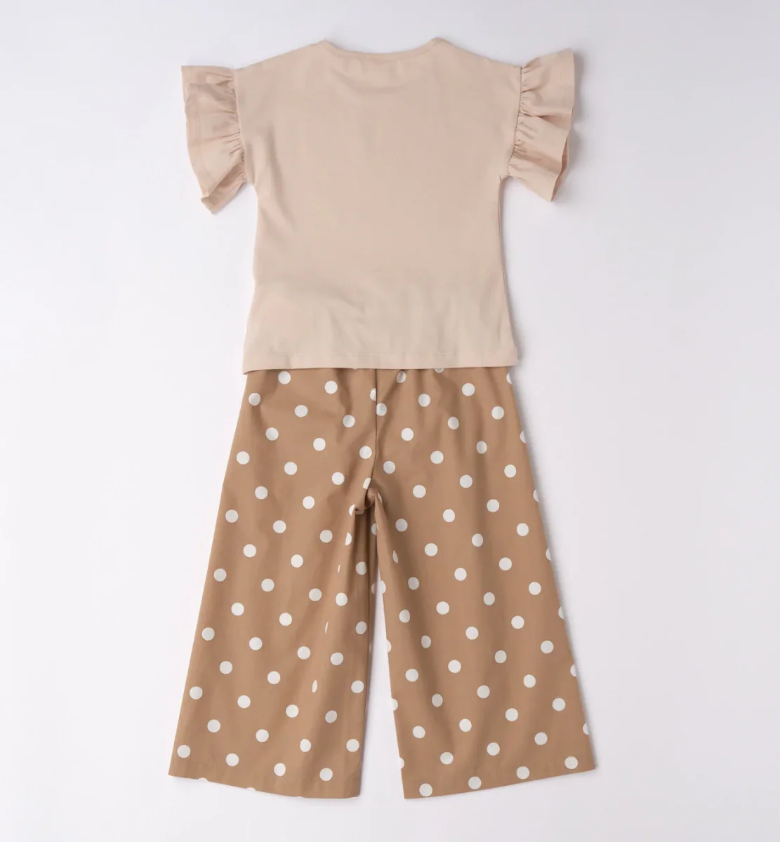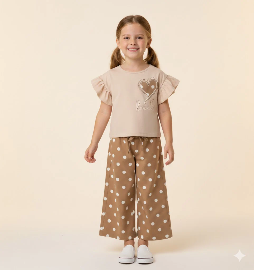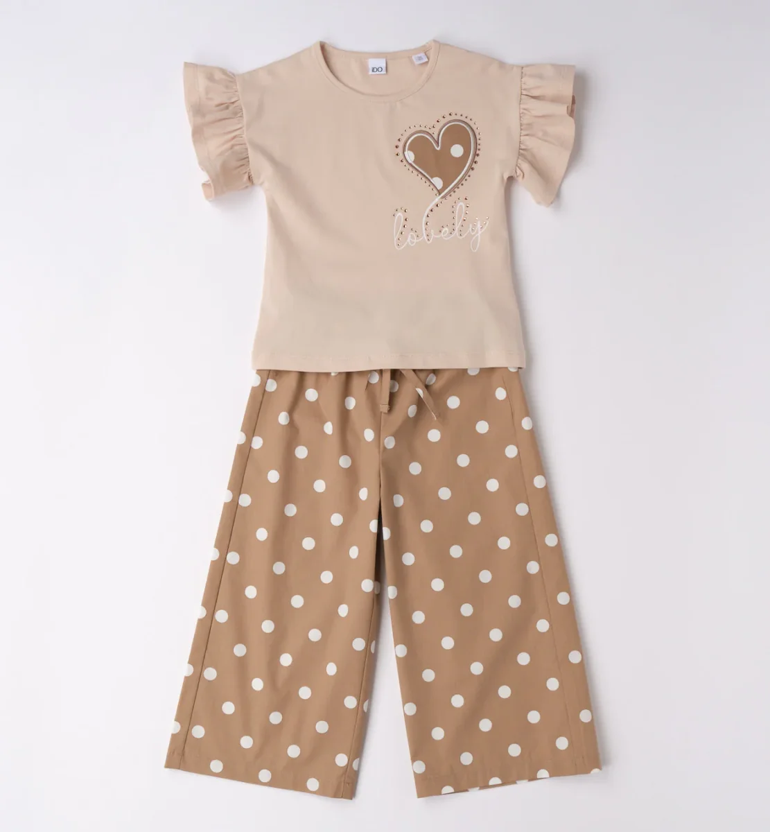 completo bambina beige con pantalone pois e t-shirt cuore lovely โ coordinato due pezzi dal gusto delicato composto da t-shirt beige con maniche a rouches e stampa cuore con scritta โlovelyโ impreziosita da piccoli dettagli applicati, abbinata a pantalone ampio modello culotte con fantasia pois a contrasto. vestibilitร comoda ed elastico in vita per garantire praticitร e comfort durante tutta la giornata. perfetto per look freschi e femminili, ideale da indossare nel tempo libero o per occasioni casual chic.