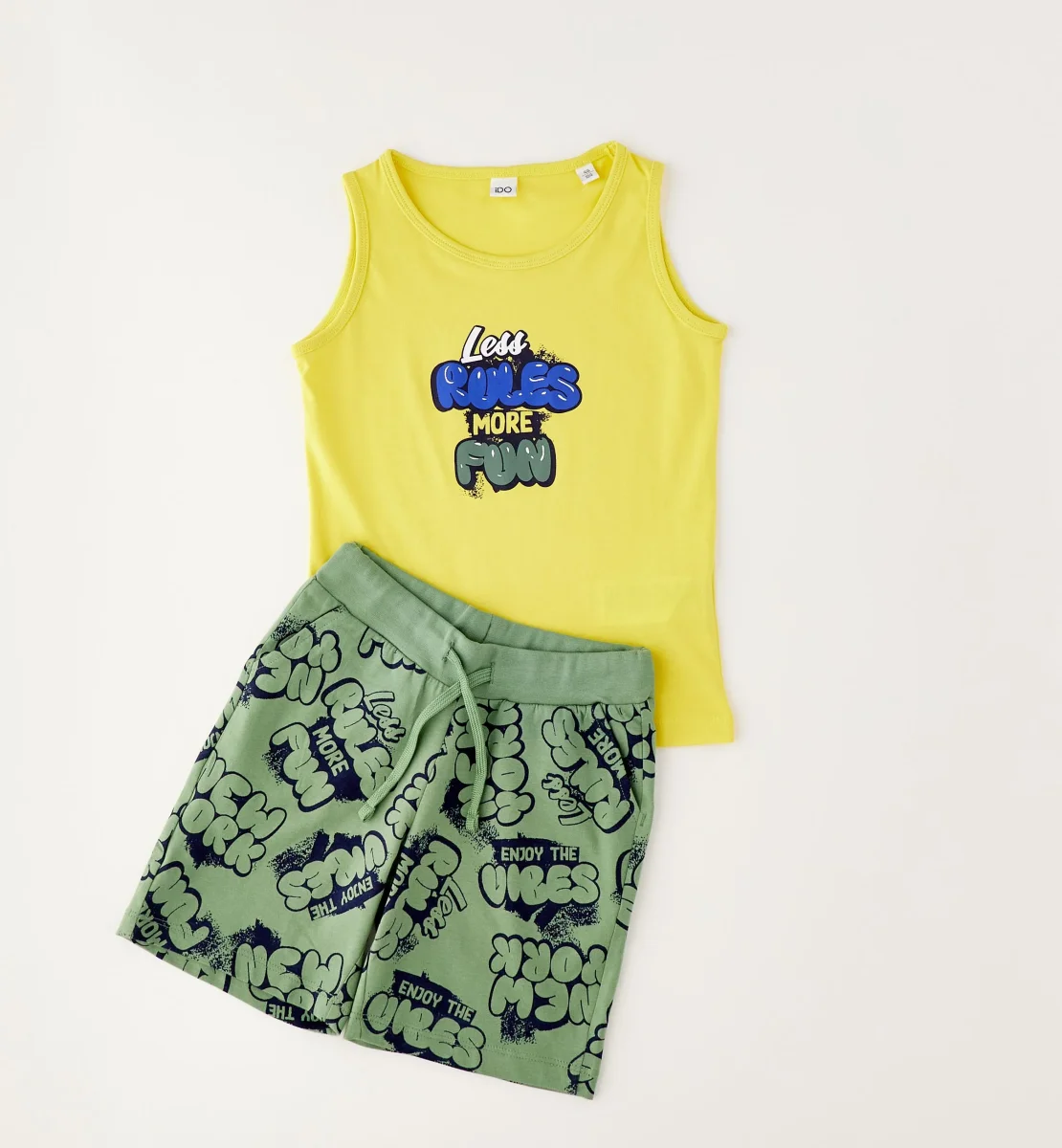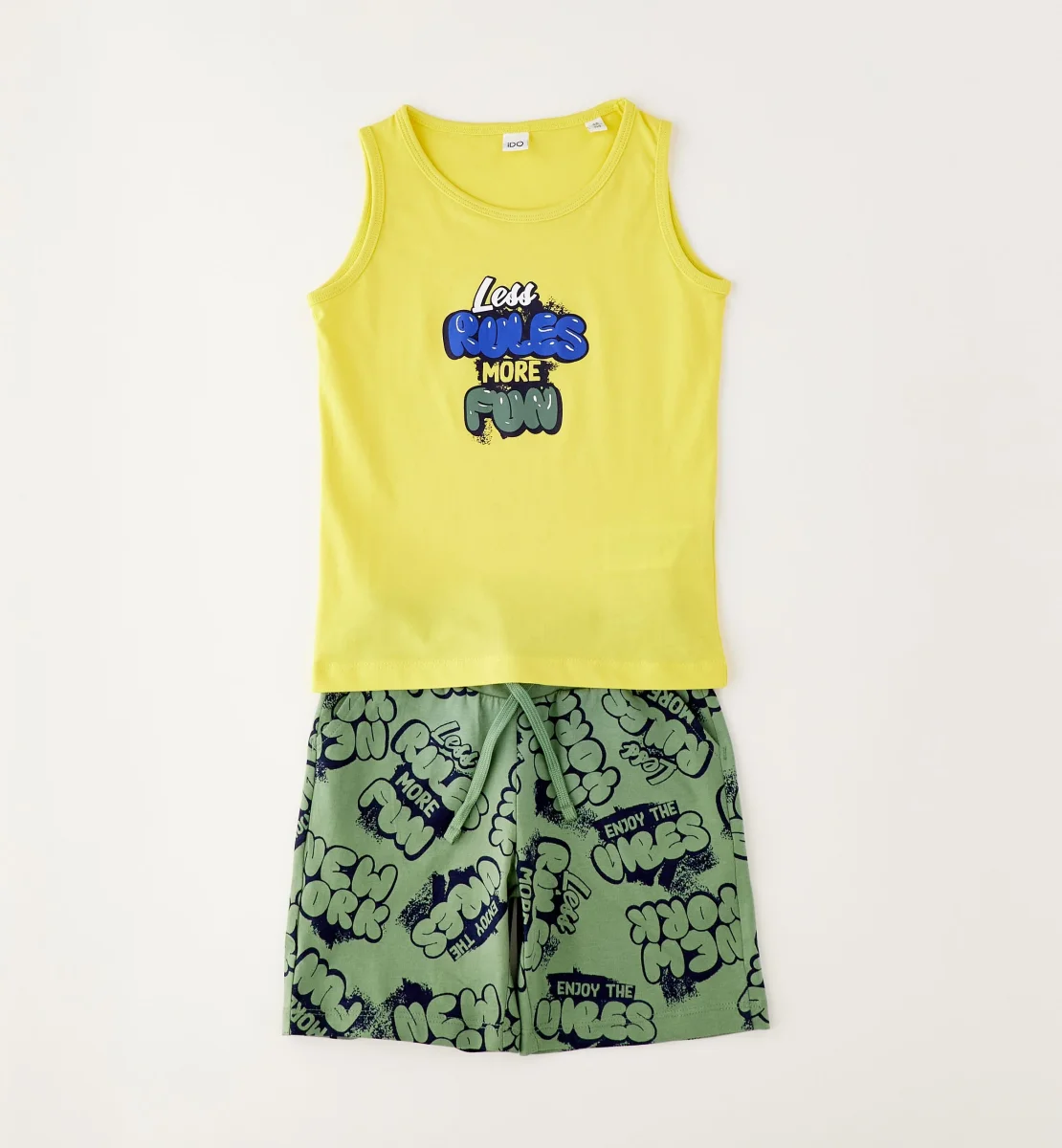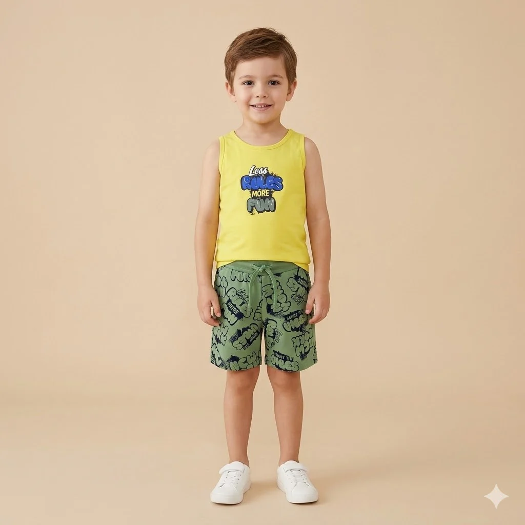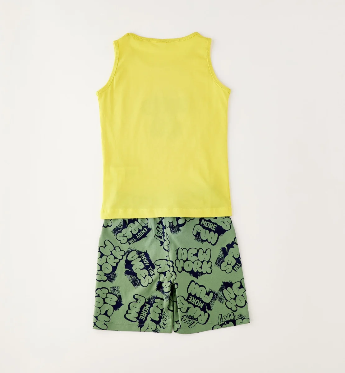 completo bambino estivo con canotta gialla e bermuda verdi stampati โ coordinato in morbido cotone composto da canotta senza maniche gialla con stampa frontale โless rules more funโ dal look urban e dinamico, abbinata a bermuda verde salvia con stampa all over โenjoy the vibes new yorkโ. il pantaloncino presenta elastico in vita con coulisse regolabile per una vestibilitร comoda e pratica durante tutta la giornata. un outfit fresco e grintoso perfetto per il tempo libero e le giornate estive, ideale da indossare con sneakers o sandali sportivi per uno stile casual e moderno.