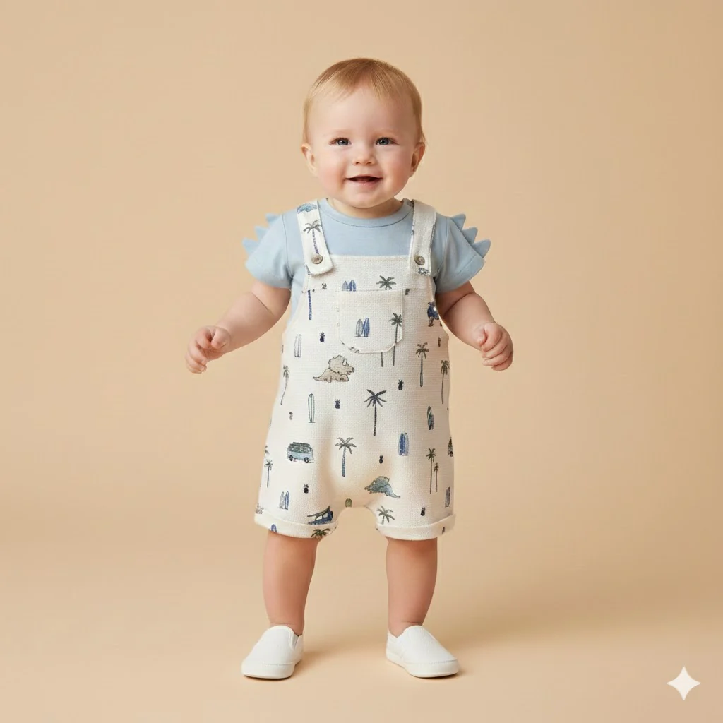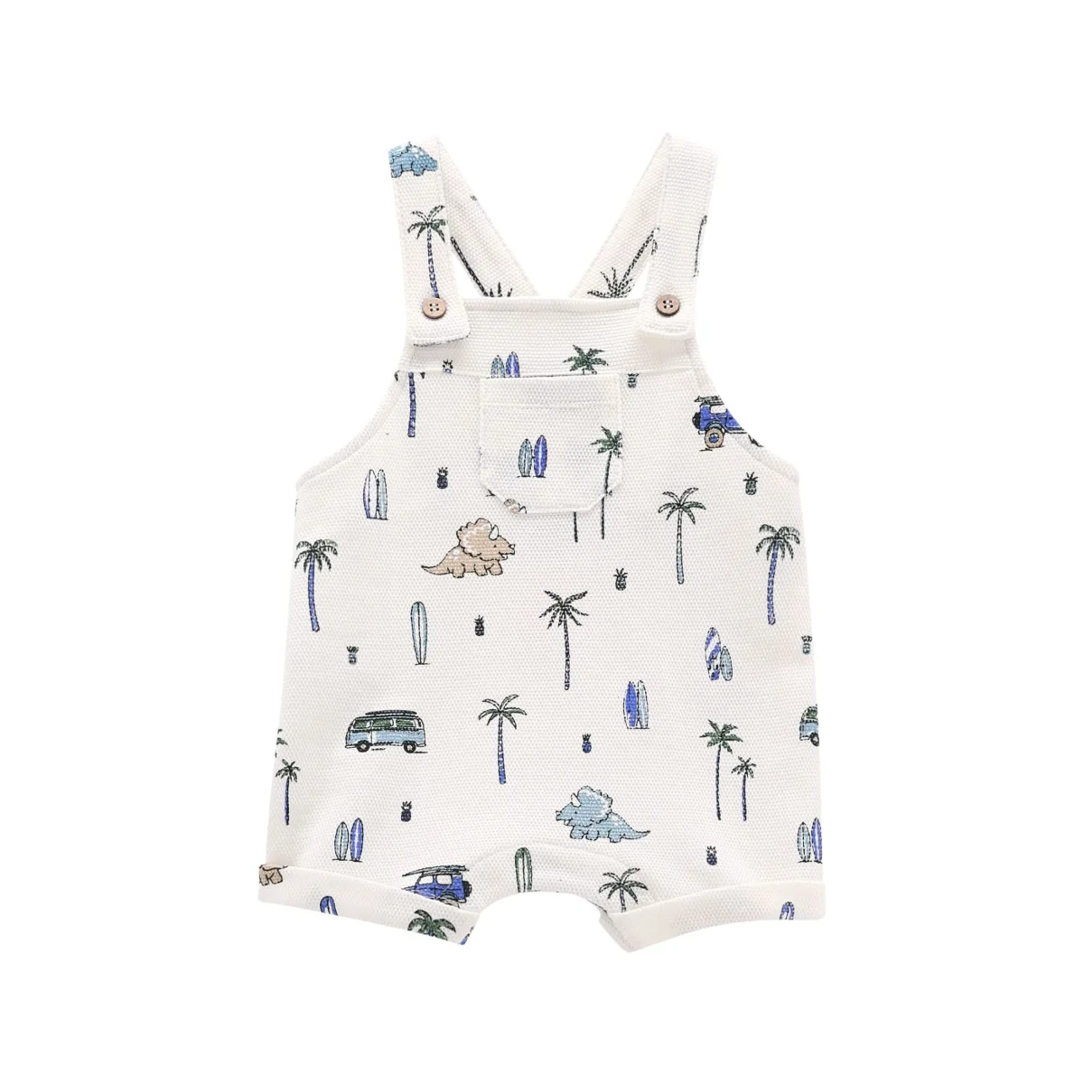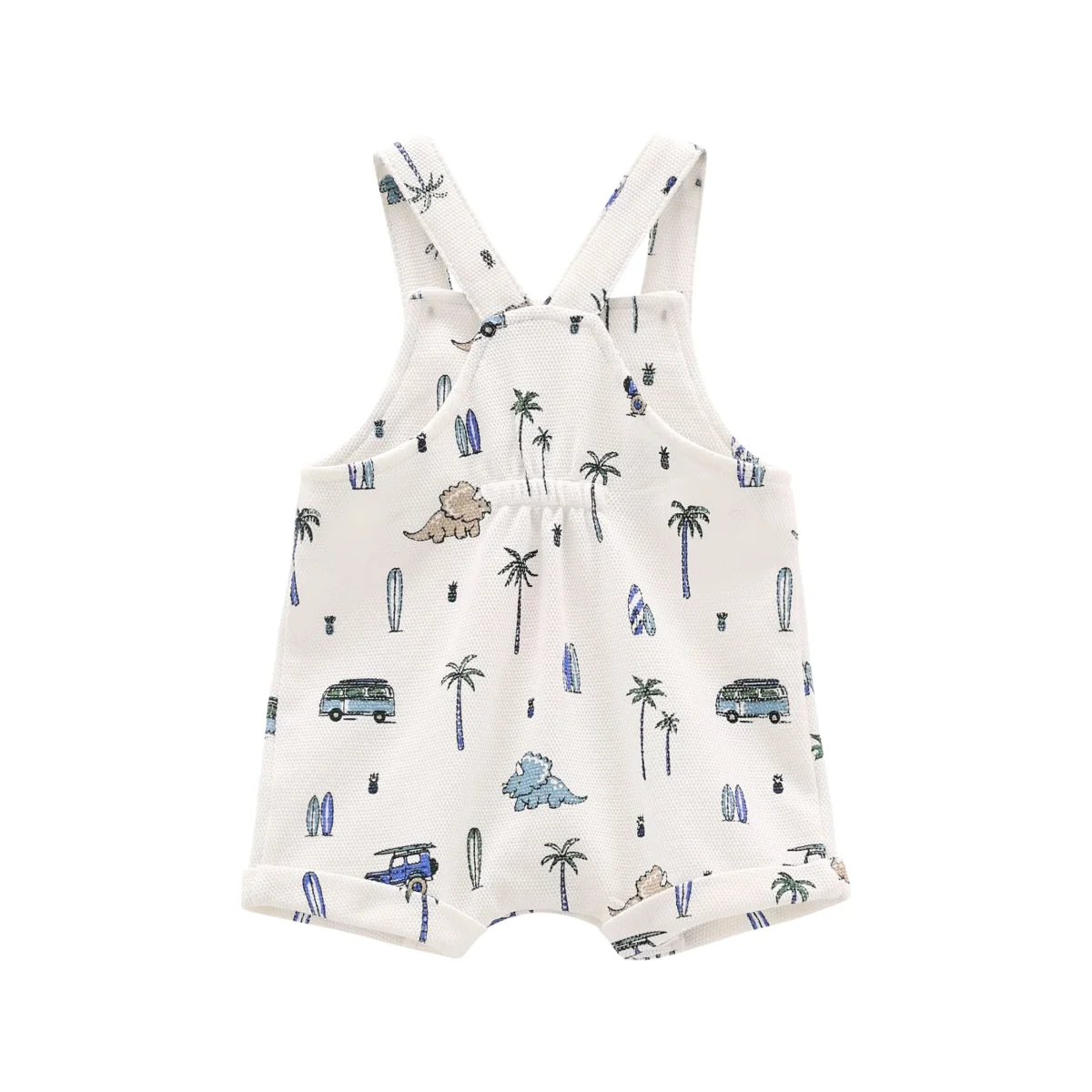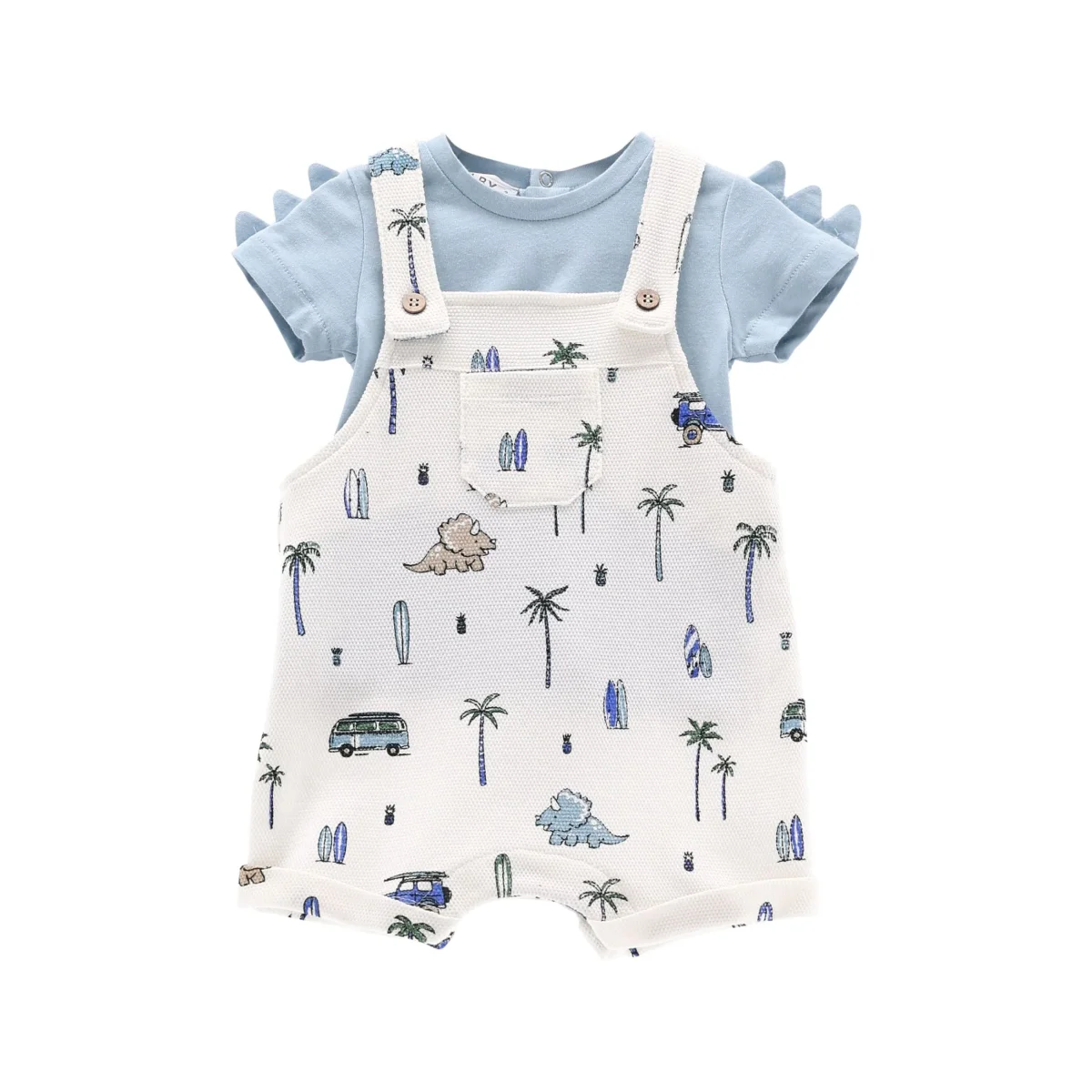 completo bambino salopette fantasia dinosauri e t-shirt azzurra โ completino due pezzi in morbido cotone pensato per un look estivo fresco e giocoso. salopette corta color panna con stampa all-over dinosauri, palme e van in stile vacanziero, dotata di bretelle con bottoncini e taschina frontale che aggiunge un dettaglio pratico e tenero. abbinata a t-shirt azzurro cielo con manica corta e apertura sul retro con bottoncini per facilitare la vestizione, arricchita da simpatiche applicazioni sulle spalle. vestibilitร comoda e tessuti leggeri, ideale per il tempo libero e le prime uscite con uno stile allegro e originale