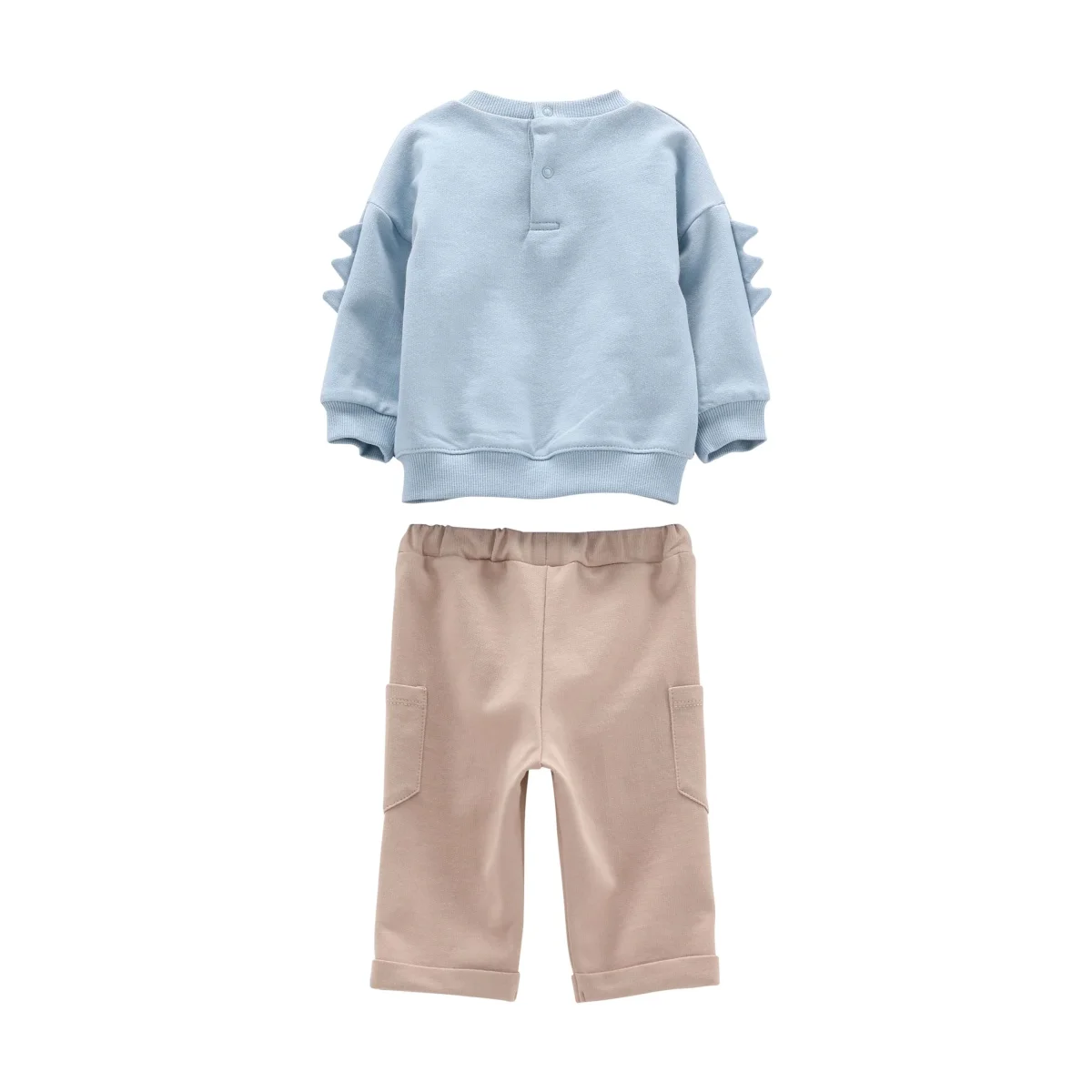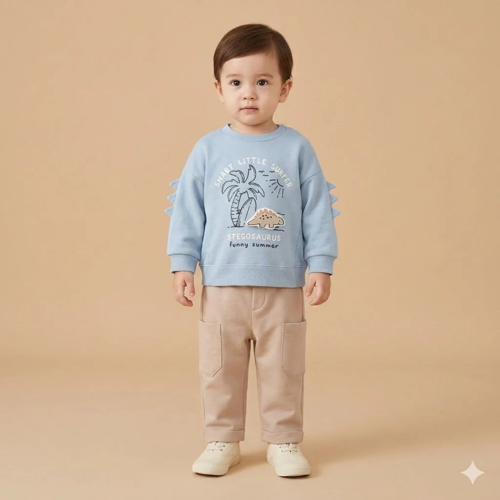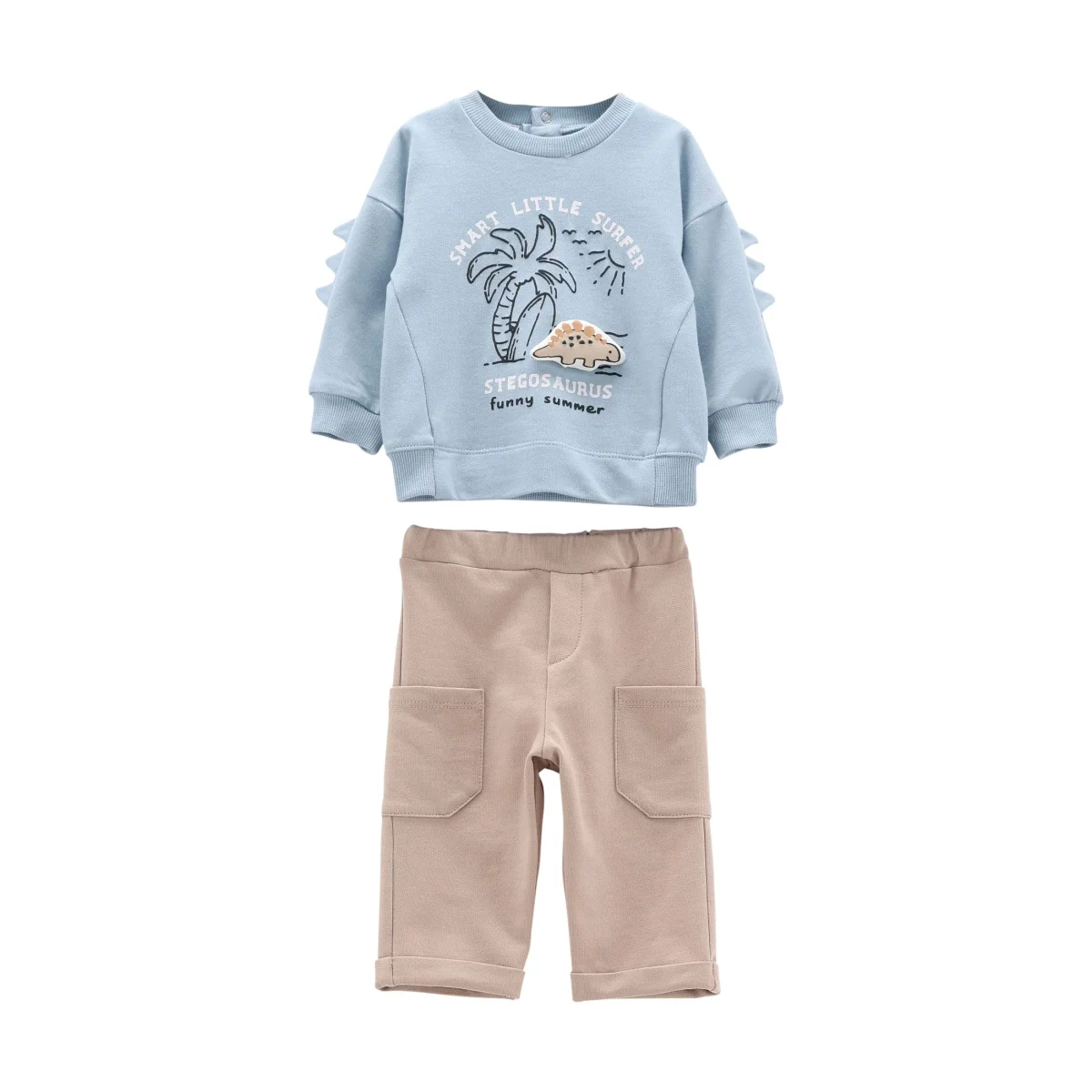 completo felpa e pantaloni bambino azzurro e beige con stampa dinosauro โ set due pezzi in morbido cotone pensato per il comfort quotidiano, composto da felpa girocollo azzurro polvere con stampa frontale โsmart little surferโ e simpatico dinosauro, arricchita da dettagli tridimensionali sulle maniche, abbinata a pantaloni beige con vita elasticizzata e tasche applicate. modello dalla vestibilitร comoda, pratico e confortevole, ideale per il gioco e il tempo libero. un completo dallo stile fresco e divertente, perfetto da indossare insieme o da abbinare separatamente a t-shirt e sneakers per un look casual e curato ogni giorno.