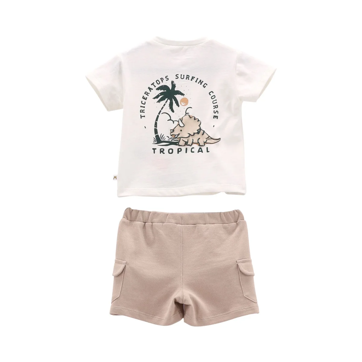 completo bambino t-shirt panna e bermuda beige con stampa dinosauro tropical โ completo due pezzi in morbido cotone pensato per il comfort quotidiano, composto da t-shirt a manica corta color panna con taschino sul davanti e simpatica stampa dinosauro sul retro, abbinata a bermuda beige con elastico in vita e tasche laterali stile cargo. modello pratico e fresco, ideale per la stagione estiva, perfetto per accompagnare i piรน piccoli nelle giornate di gioco e movimento. facile da abbinare a sneakers o sandalini per un look casual, curato e divertente.
