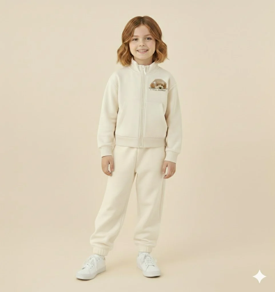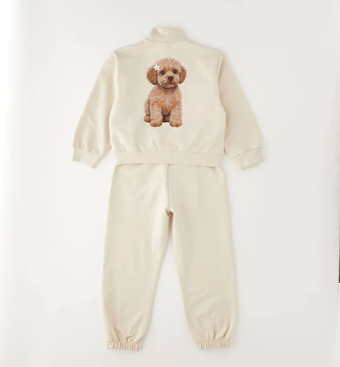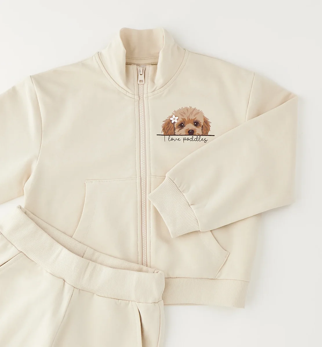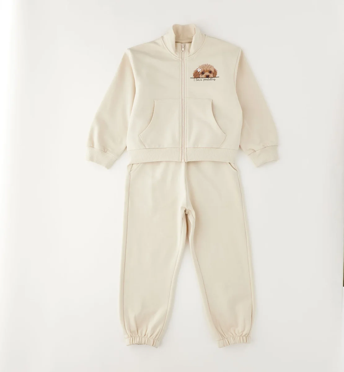 completo tuta bambina beige con felpa zip e stampa cagnolino โ completo sportivo in morbido cotone felpato composto da felpa con zip frontale, tasche a marsupio e dolce stampa cagnolino lato cuore con scritta โlove poodlesโ, abbinata a pantaloni jogger con elastico in vita e fondo caviglia arricciato. vestibilitร comoda e avvolgente, ideale per il tempo libero e la scuola, perfetto da indossare con sneakers per un look tenero e confortevole di tutti i giorni.