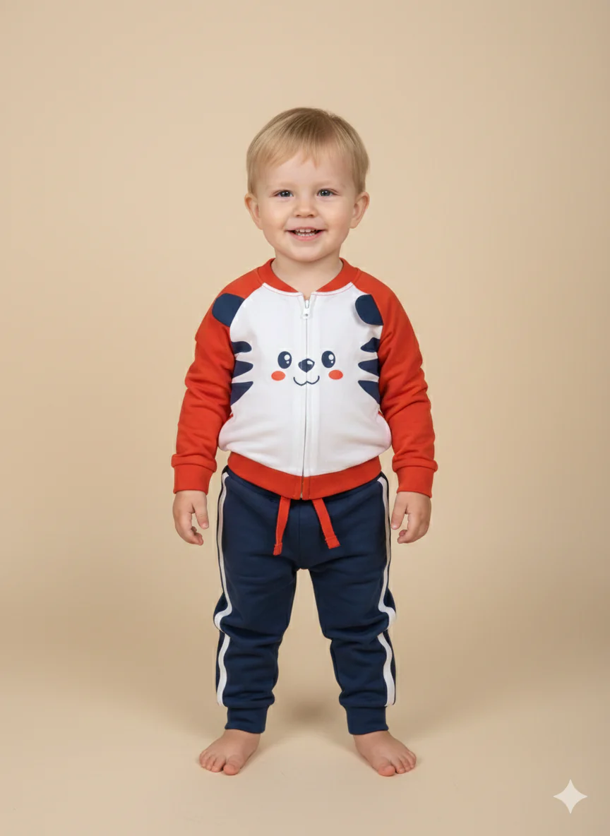 completo sportivo bambino arancione e blu con stampa tigrotto โ tuta due pezzi in felpa di cotone composta da giacca con zip e pantalone coordinato blu, caratterizzata da grafica frontale tigrotto multicolor. modello pratico con elastici su polsi e caviglie e coulisse in vita, perfetto per outfit dinamici e confortevoli dedicati al tempo libero.