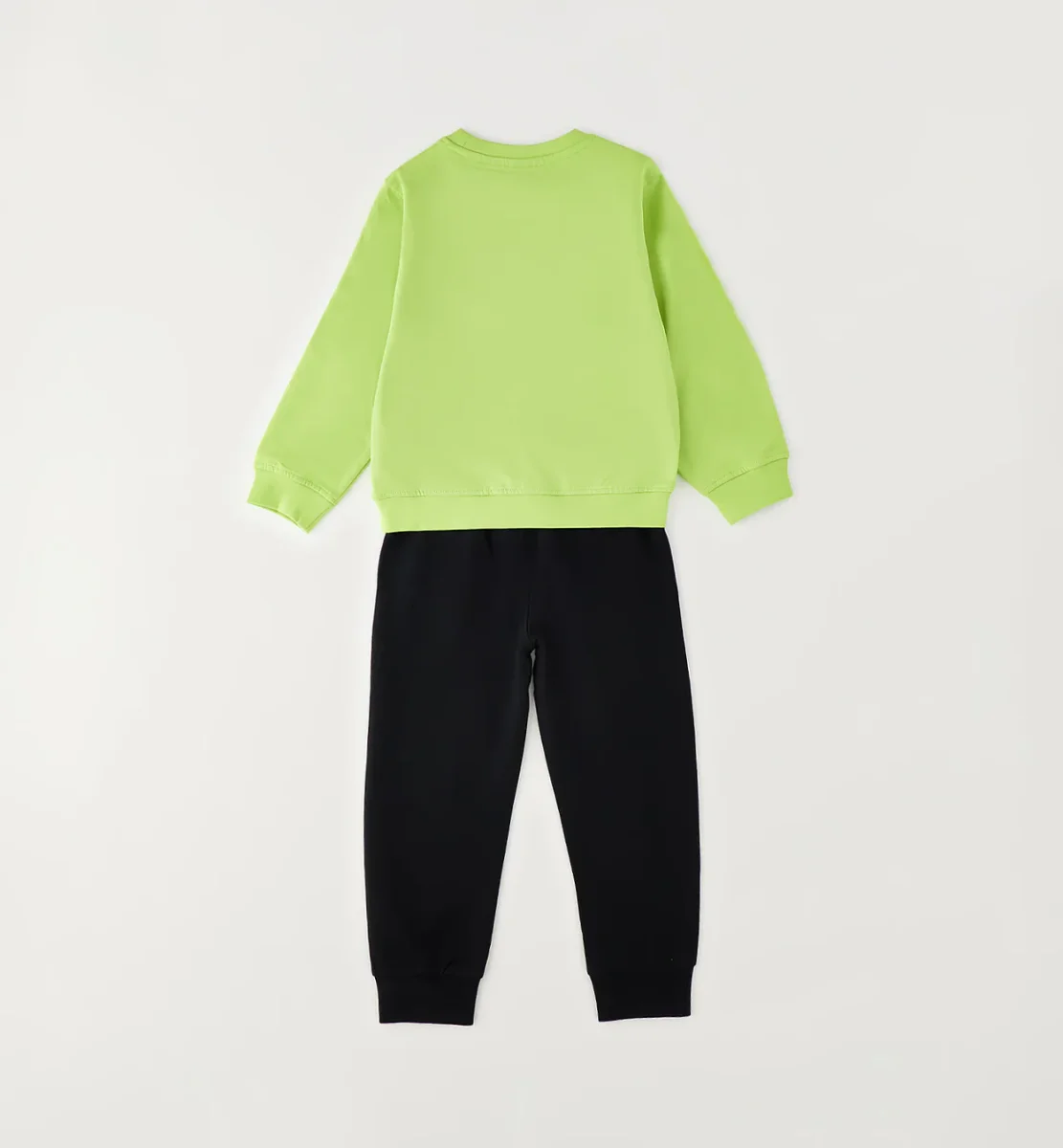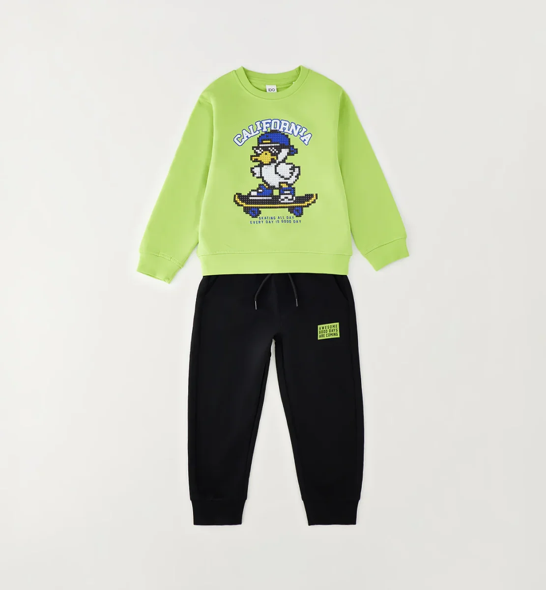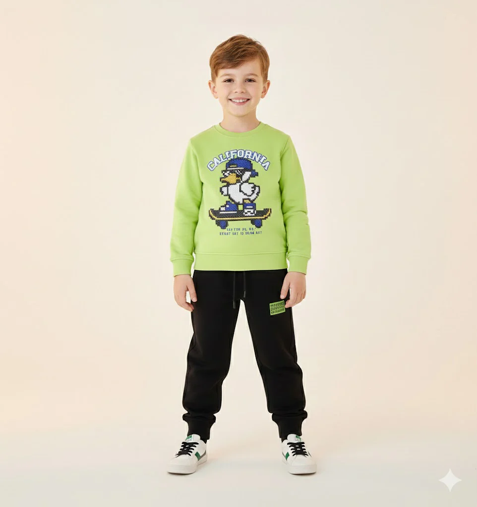 completo tuta bambino verde fluo e nero con stampa california โ set sportivo in felpa composto da sweatshirt girocollo verde fluo e pantalone nero coordinato, perfetto per look dinamici e di tendenza. felpa con stampa frontale โcaliforniaโ e gabbiano skateboarder in stile pixel che dona un tocco urban e divertente. pantalone con elastico in vita, coulisse regolabile e polsini sul fondo, arricchito da etichetta stampata laterale. ideale da indossare insieme o separato per outfit casual comodi e grintosi.