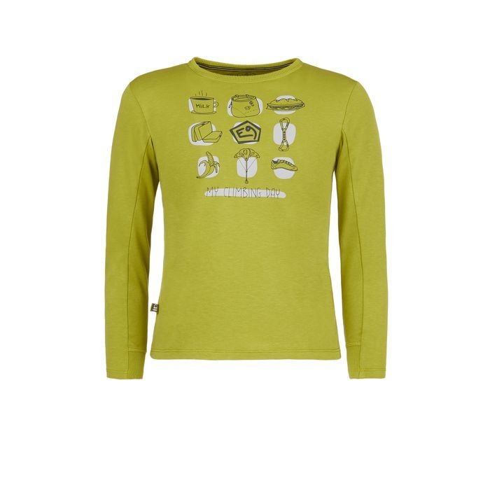 E9 maglietta bimbo B Myday. L’E9 maglietta bimbo B Myday รจ un t-shirt manica lunga in cotone e canapa girocollo da ragazzino colorata con stampa serigrafata sul petto con soggetti arrampicata. materiale: 70% cotone 30% canapa vestibilitร regolare le taglie si riferiscono all’etร del bimbo 100% fatta in italia da climber per i climber