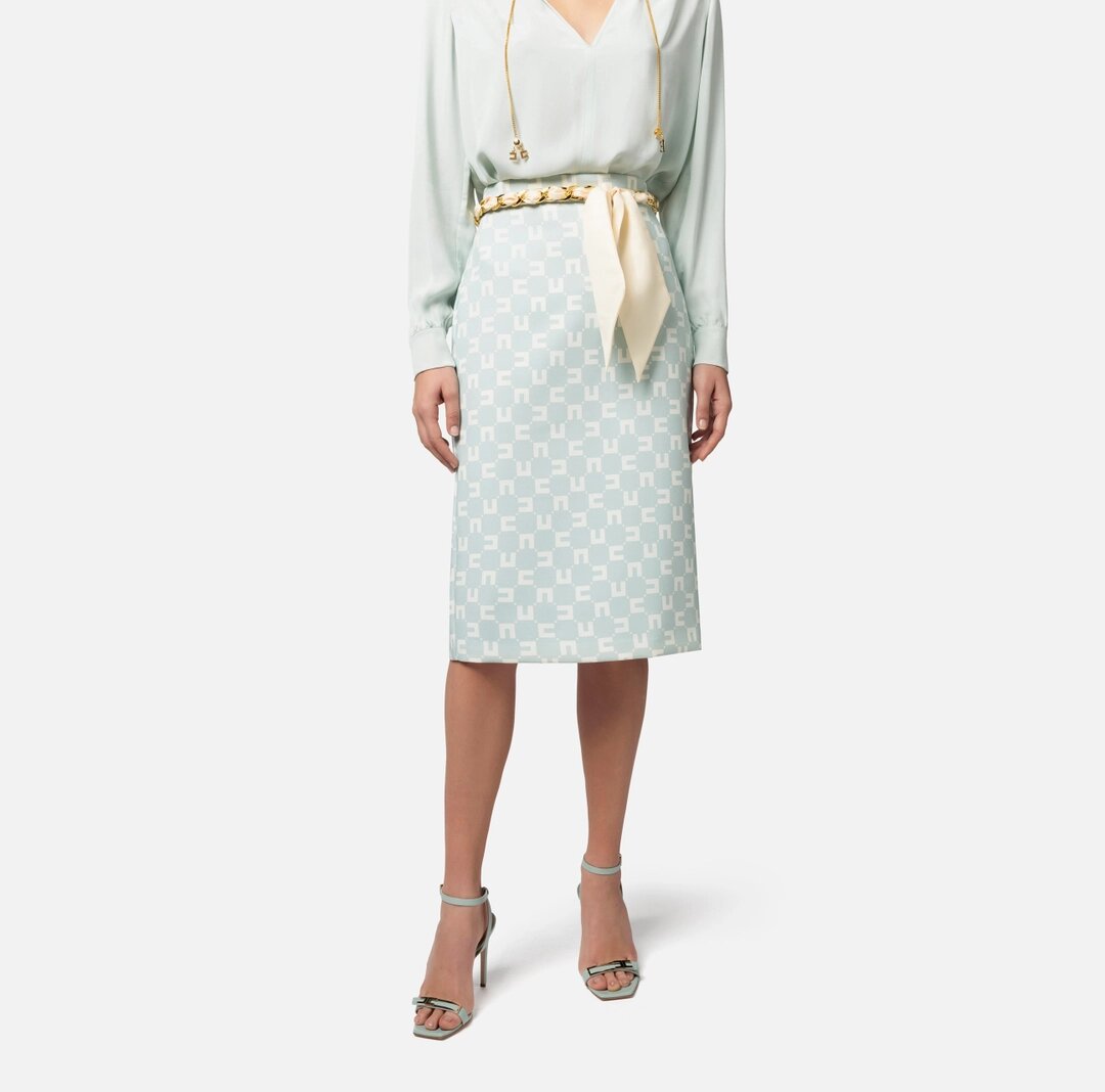 Gonna midi in doppio crêpe stretch stampa logo all-over. Il punto vita è enfatizzato da un accessorio in catena e foulard infilato.