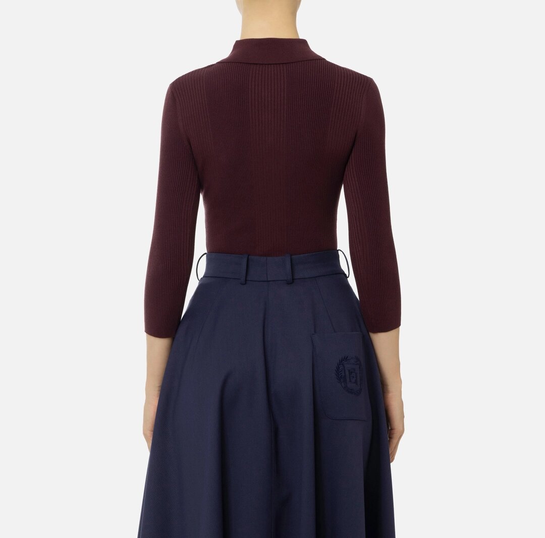 Maglia in viscosa e seta a costine a maniche 3/4 con collo a polo e tasca con ricamo logo rifinita da bottoni in metallo dorato.