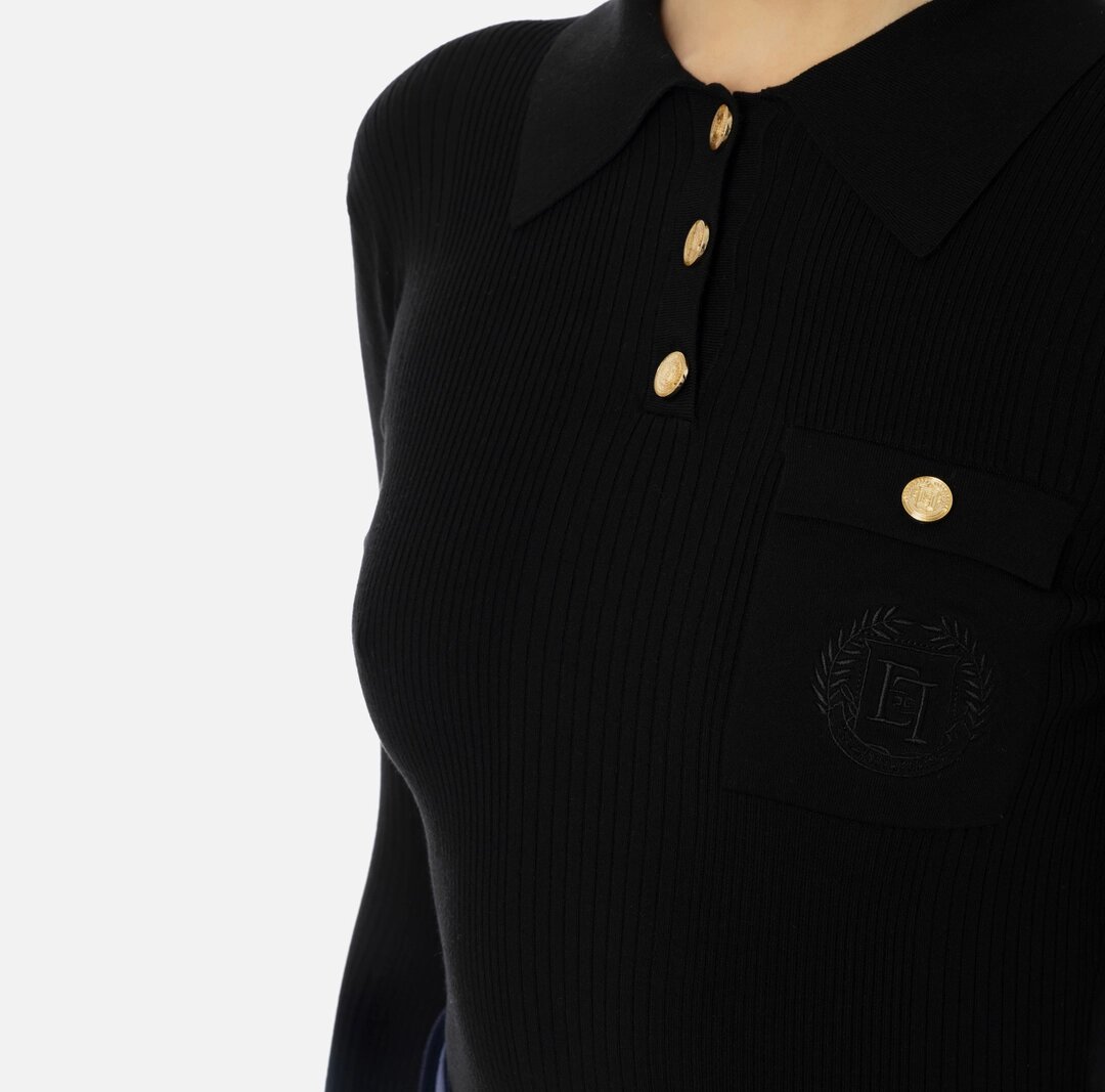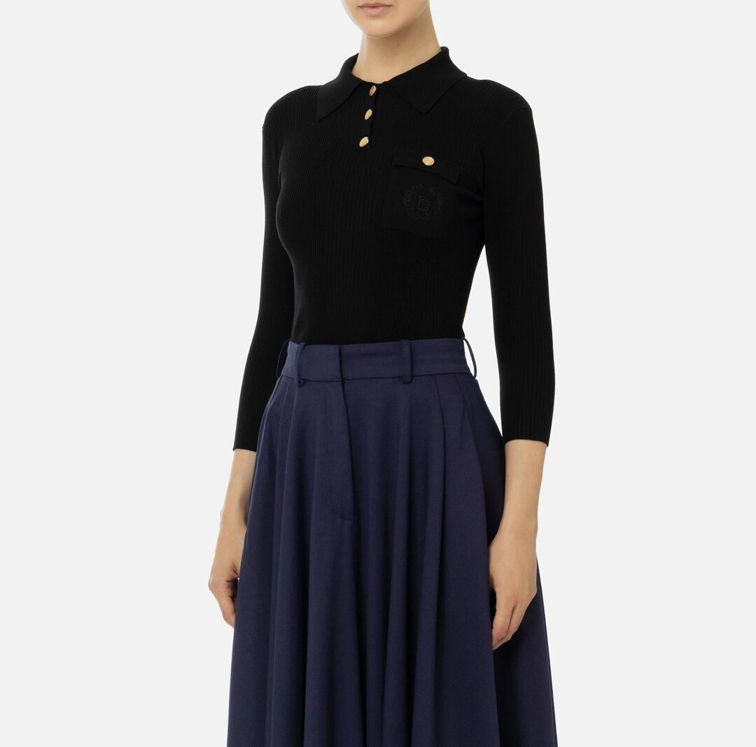 Maglia in viscosa e seta a costine a maniche 3/4 con collo a polo e tasca con ricamo logo rifinita da bottoni in metallo dorato.