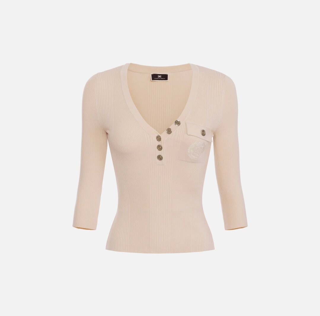 Maglia in viscosa e seta a costine a maniche a 3/4 con scollo a V e tasca con ricamo logo rifinita da bottoni in metallo dorato.