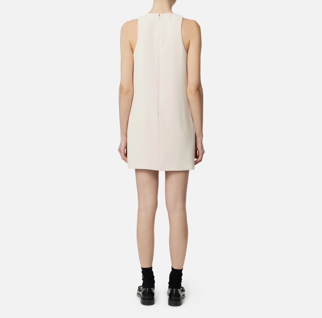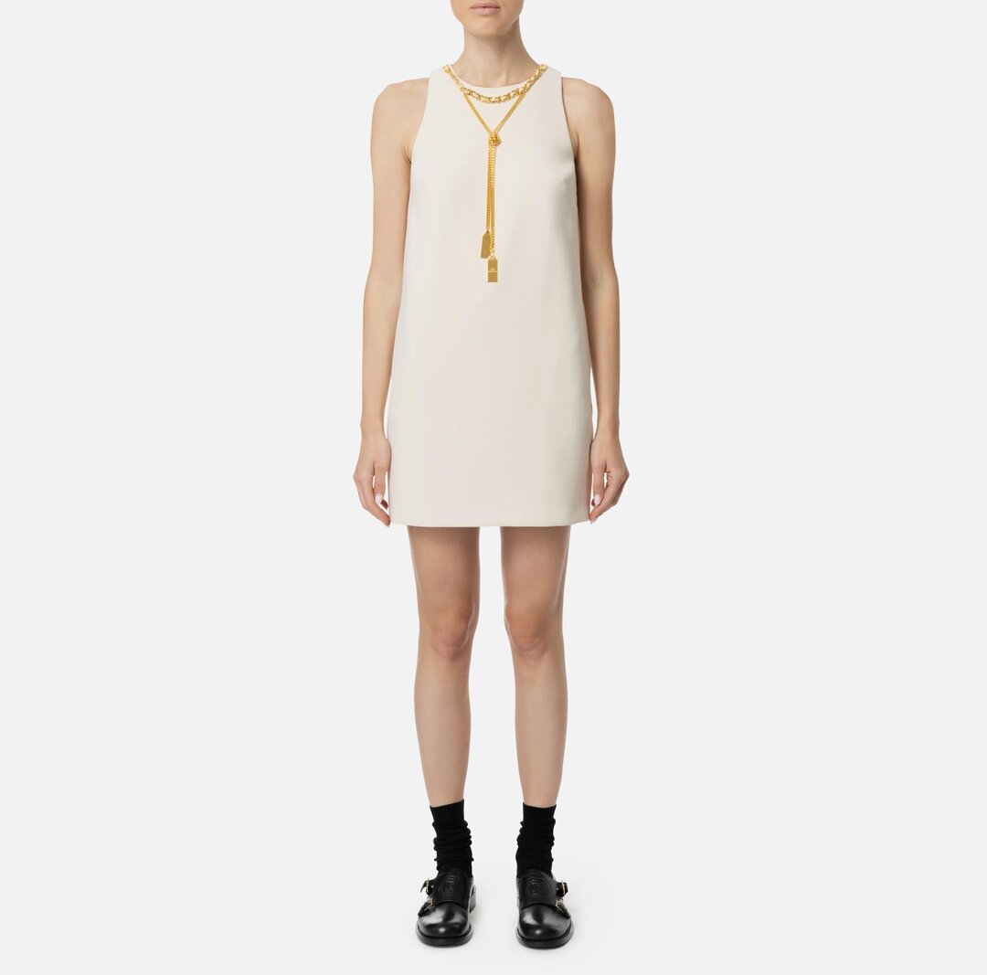 Miniabito smanicato in crêpe stretch dalla linea boxy. È caratterizzato da scollo a giro impreziosito da collana removibile in doppia catena e charms logo in metallo dorato.