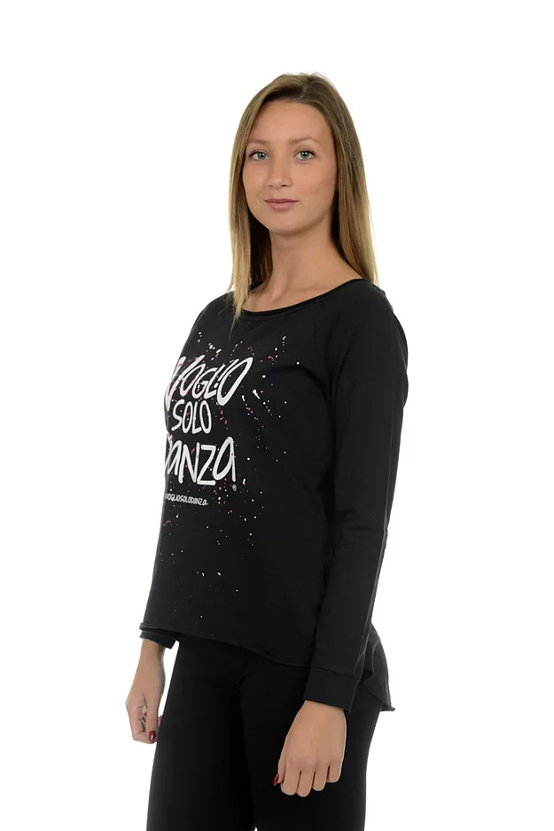 Felpa a coda con logo classico bianco e schizzi di colore รจ un prodotto pensato per la danza classica e moderna, il tempo libero e il tuo vestire casual. Vestibilitร comoda e ampia, piรน corta avanti e piรน lunga dietro e davvero una delle nostre felpe piรน amate. Si abbina perfettamente con leggins e dance jogging della nostra collezione. Lo scollo largo sul collo e il polsino sulle maniche la rendono unica nel suo genere. Gli schizzi di colore sono fatti a mano e rendono unico e diverso ogni capo uno dall’altro. Da coordinare con il pantalone dance jogging schizzato della nostra collezione.