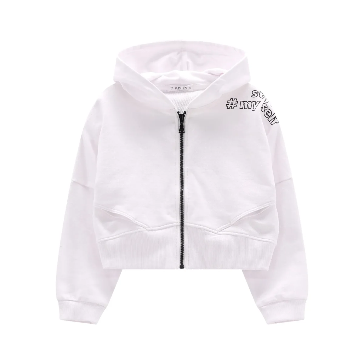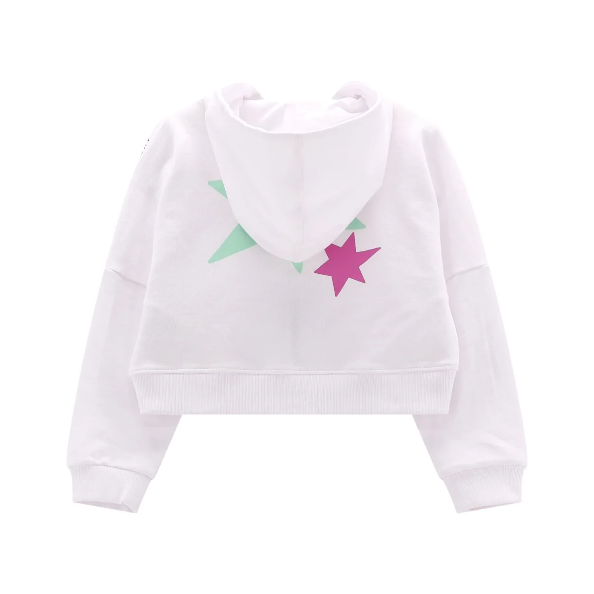 felpa con cappuccio bambina e ragazza bianca con zip e stampa colorata โ€“ felpa corta in morbido cotone dallo stile fresco e contemporaneo, pensata per bambine e ragazze che amano un look trendy e leggero. il modello รจ caratterizzato da cappuccio, chiusura frontale con zip e polsini elasticizzati per una vestibilitร  comoda e moderna. sul davanti presenta una scritta discreta, mentre sul retro spicca una stampa con stelle colorate che dona un tocco vivace e giocoso al capo. ideale da abbinare a leggings, jogger o jeans a vita alta per creare outfit casual ma curati, perfetti per scuola e tempo libero.