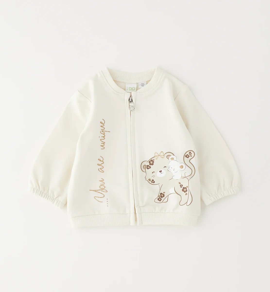 felpa con zip bambina panna con stampa animaletto e scritta glitter โ felpa in morbido cotone garzato dalla mano calda e confortevole, impreziosita da grafica frontale con tenero animaletto e dettaglio scritta verticale effetto glitter che dona luce al capo. modello con chiusura full zip, collo girocollo rifinito a costine ed elastico su fondo e polsini per una vestibilitร pratica e avvolgente, perfetta da abbinare a leggings o pantaloni sportivi per look quotidiani dolci e curati.