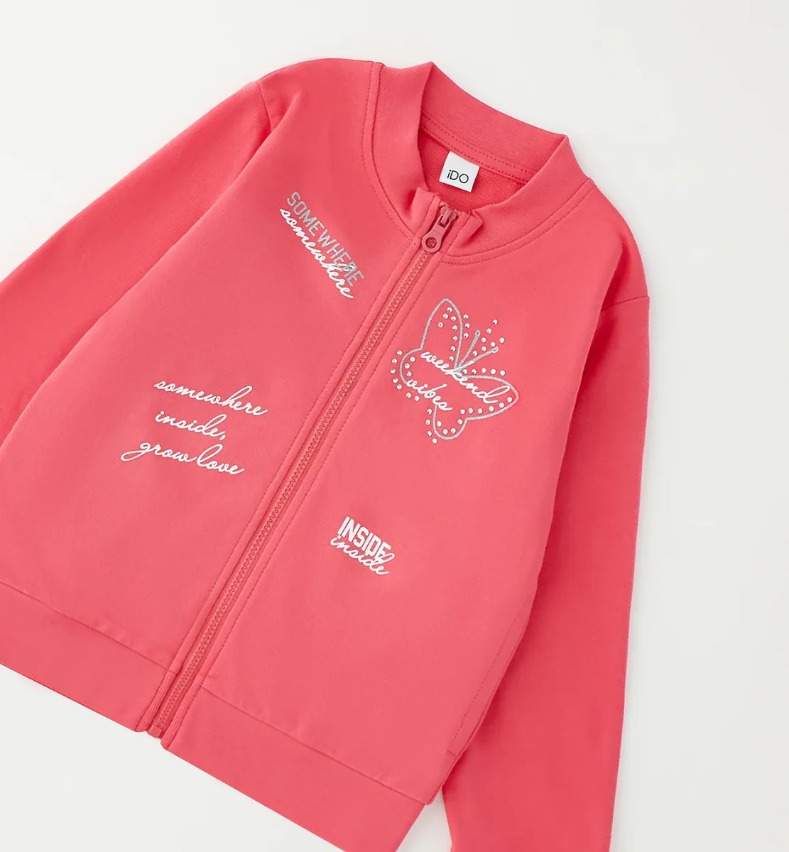 felpa con zip bambina corallo con stampa farfalla โ felpa in morbido cotone dalla vestibilitร comoda, caratterizzata da chiusura frontale con zip e collo bomber che dona un tocco sportivo e moderno. impreziosita da grafiche stampate e scritte lettering sul davanti con dettaglio farfalla decorata da piccoli punti luce che aggiungono brillantezza al capo. modello con polsini e fondo elasticizzati, ideale per completare outfit casual e dinamici, perfetta da abbinare a leggings, jeans o pantaloni sportivi per il tempo libero e la scuola.