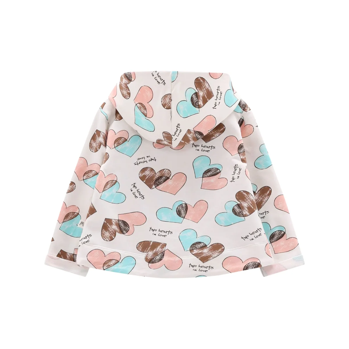 felpa con zip bambina panna con stampa cuori multicolor โ felpa in morbido cotone con cappuccio e zip frontale, caratterizzata da una vivace stampa all over di cuori nei toni rosa, azzurro e marrone con scritte decorative. modello con vestibilitร comoda, fondo leggermente stondato e polsini elasticizzati per garantire comfort e praticitร nei movimenti. perfetta per completare look casual e dolci, ideale da abbinare a leggings o jeans per outfit quotidiani dal gusto romantico.