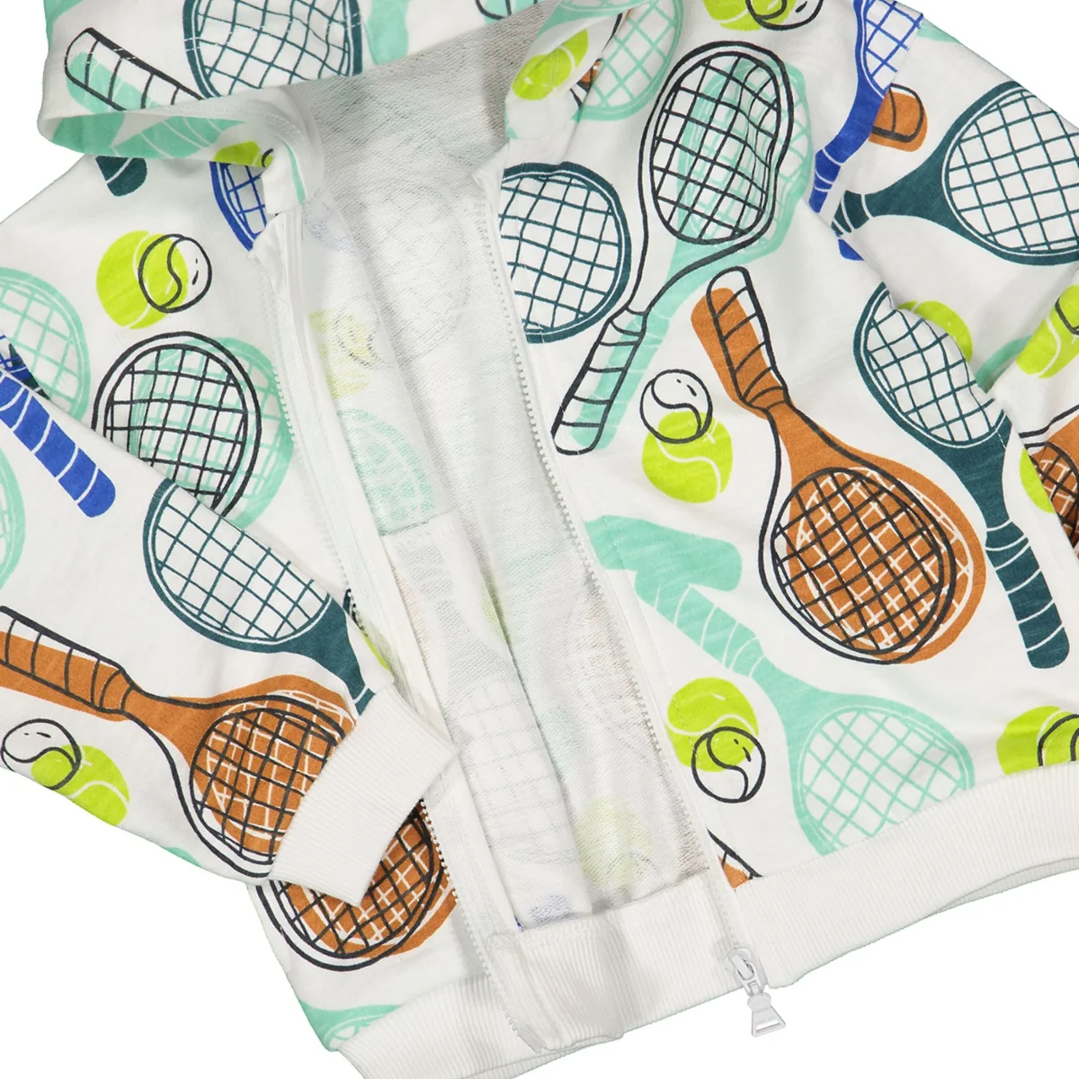 felpa con zip e cappuccio bambino panna stampa racchette tennis multicolor โ felpa in morbido cotone felpato con fantasia all over ispirata al mondo del tennis, caratterizzata da racchette e palline nei toni del verde, azzurro e arancio su base chiara. modello con zip frontale, cappuccio e polsini elasticizzati per una vestibilitร pratica e confortevole, ideale per completare look sportivi e dinamici, perfetta da abbinare a jogger o bermuda per outfit casual di stagione.