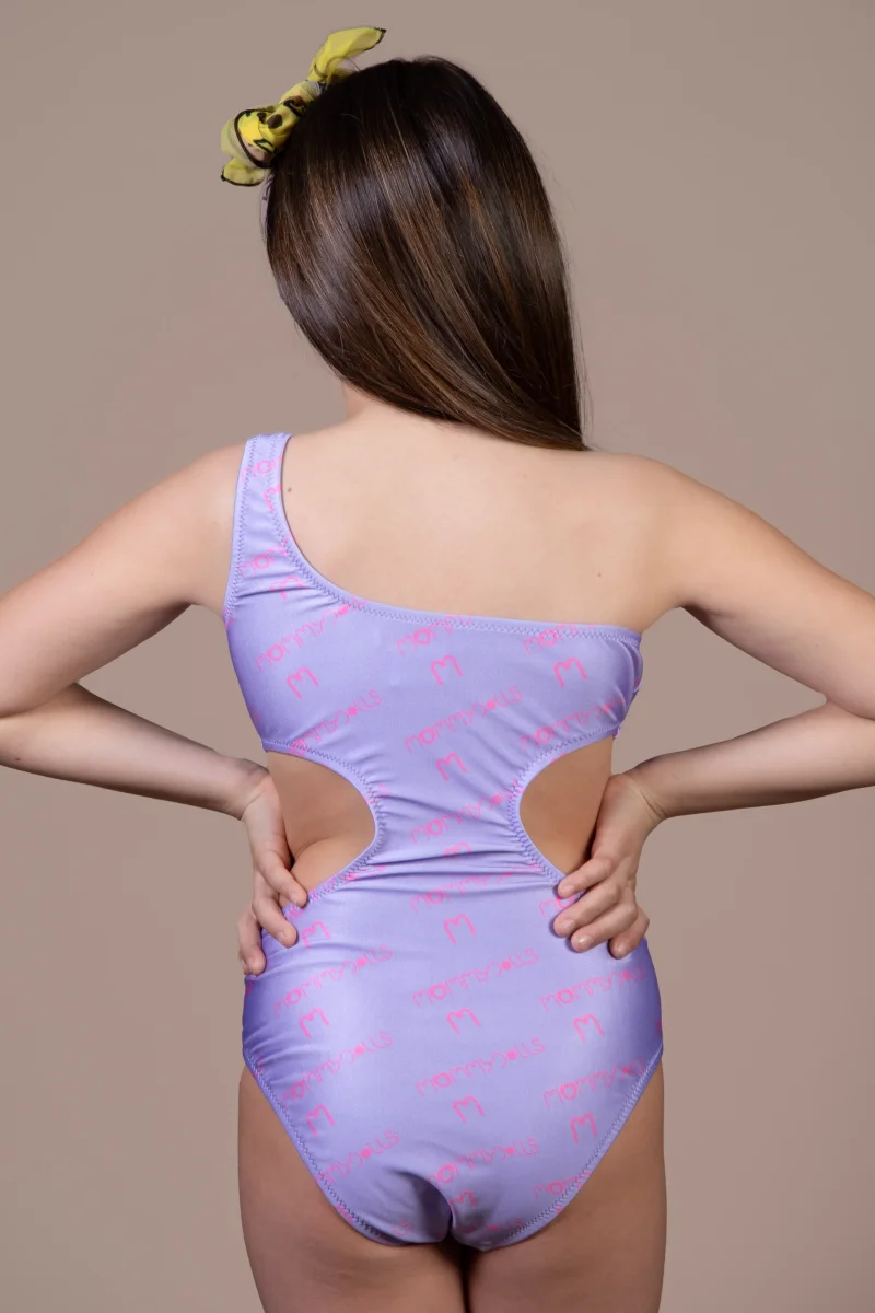 In lycra stampata monospalla con fiore , loghi e punti luce strass.