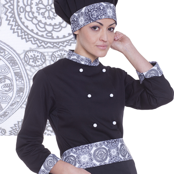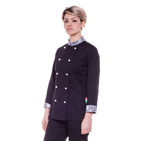 Giacca da cuoca nera con trama su polsini e collo. Realizzata in cotone egizianoย tessutoย che non trattiene nรฉ assorbe lโumiditร garantendo una sensazione di comfort e di asciutto unico durante il lavoro.
