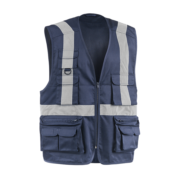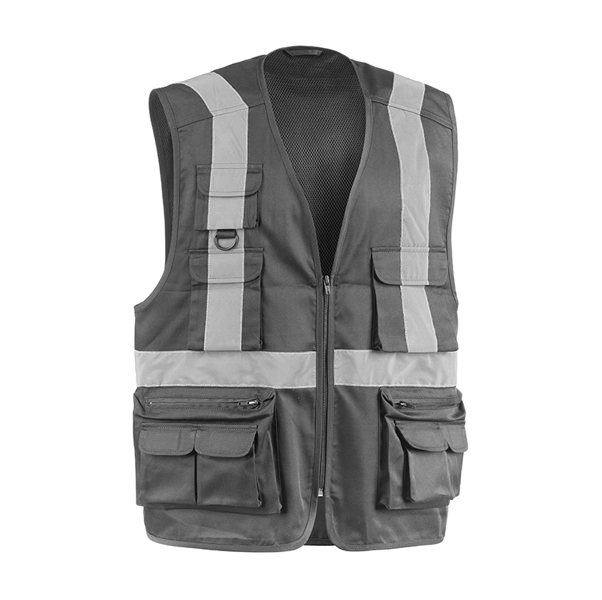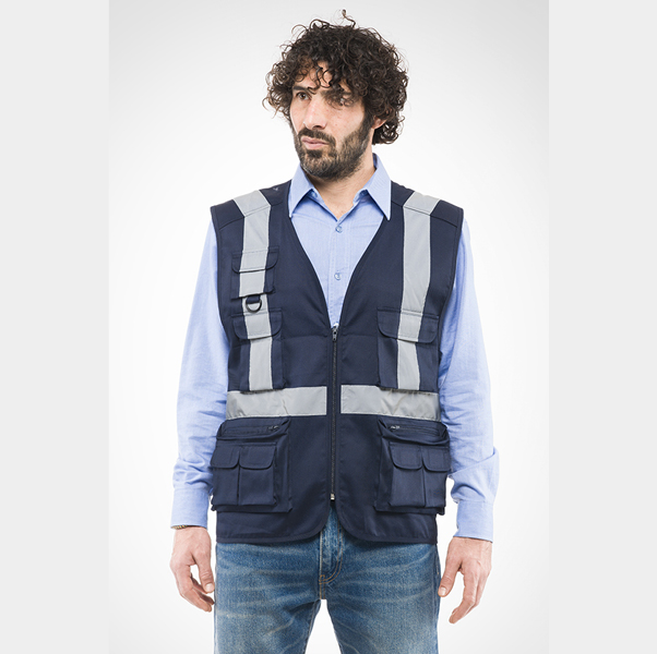 Gilet da lavoro con retinatura interna, collo a V, 8 tasche esterne, 2 tasche posteriori, 1 tasca portacellulare. Bande riflettenti su vita, torace e spalle fronte e retro.
