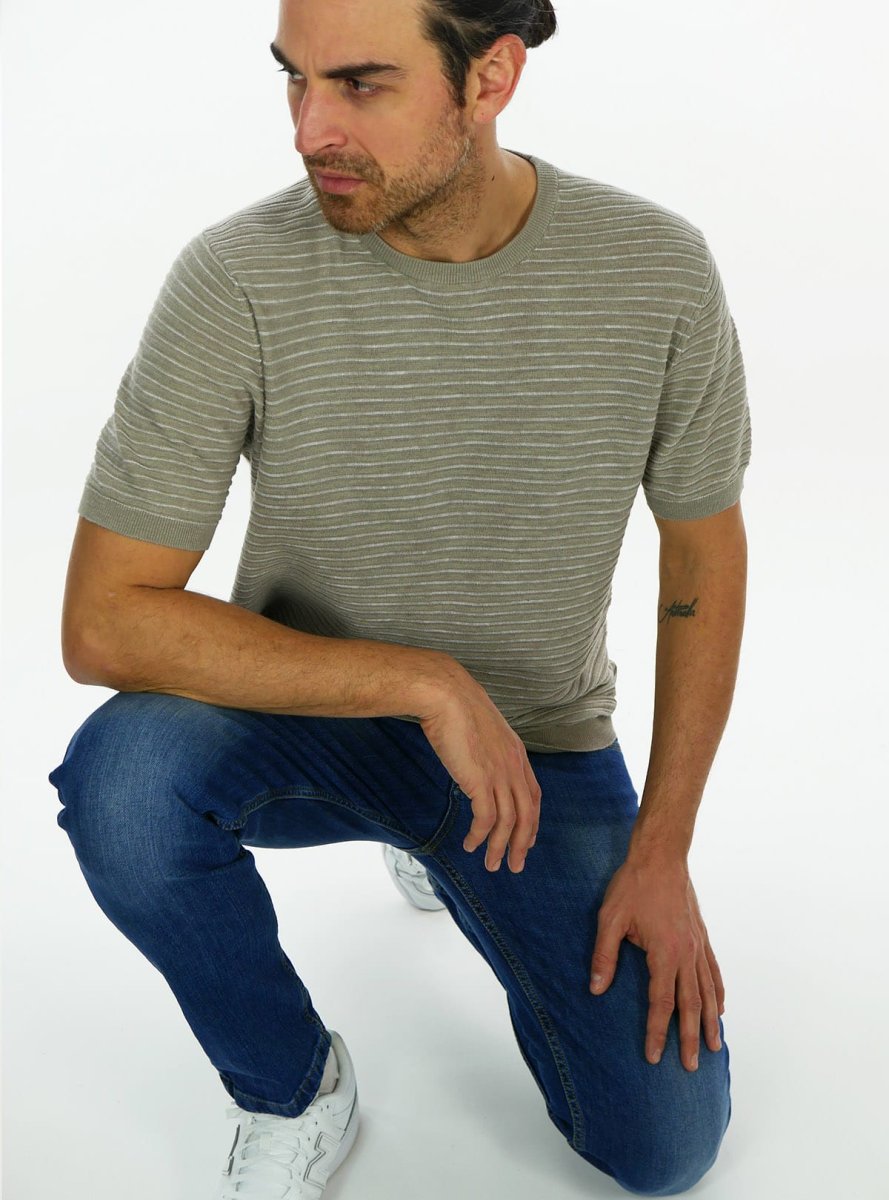 I filati naturali conferiscono eleganza e leggerezza a questa t-shirt in maglia. La texture leggermente screziata, unita alla lavorazione a righe links, la rende ideale per la stagione piรน calda.