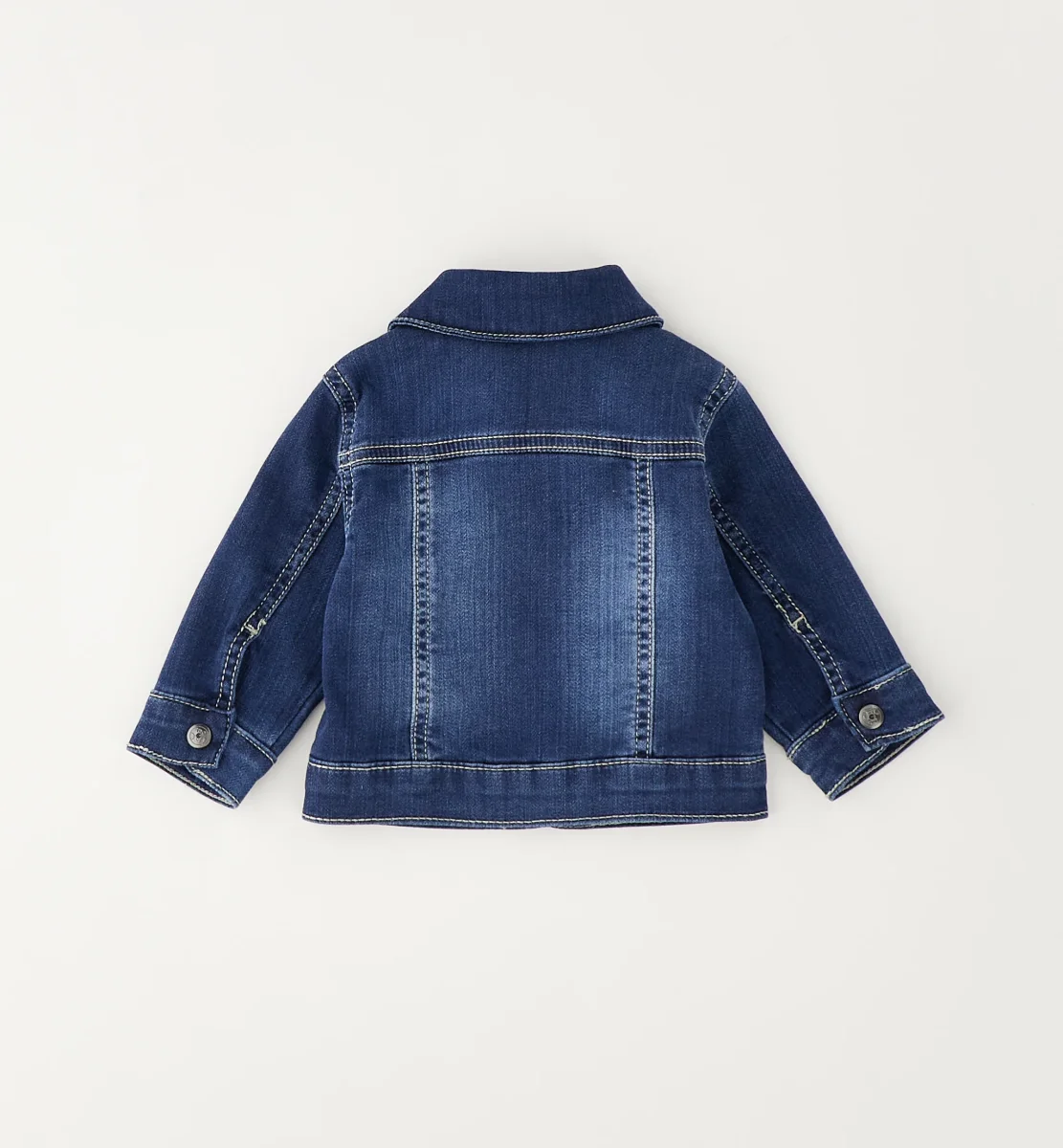 giubbino denim bambina blu con tasche frontali โ giacca in jeans dal lavaggio blu medio con leggere sfumature effetto used che donano carattere al capo. modello con colletto classico, chiusura frontale con bottoni logati e doppie tasche applicate sul petto con patta. cuciture a contrasto e fondo rifinito completano il design, mentre il denim morbido garantisce comfort e libertร di movimento. perfetto per outfit casual di mezza stagione, ideale su abiti, leggings o pantaloni.