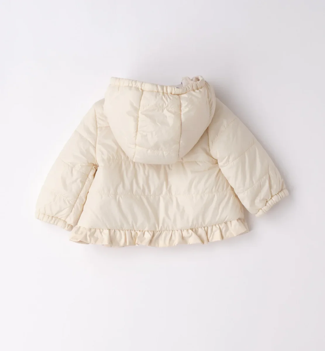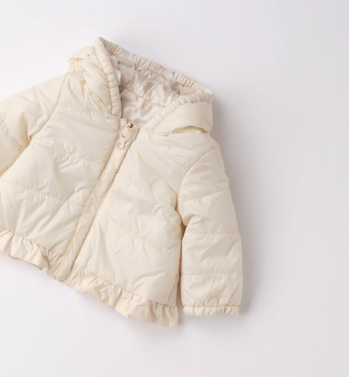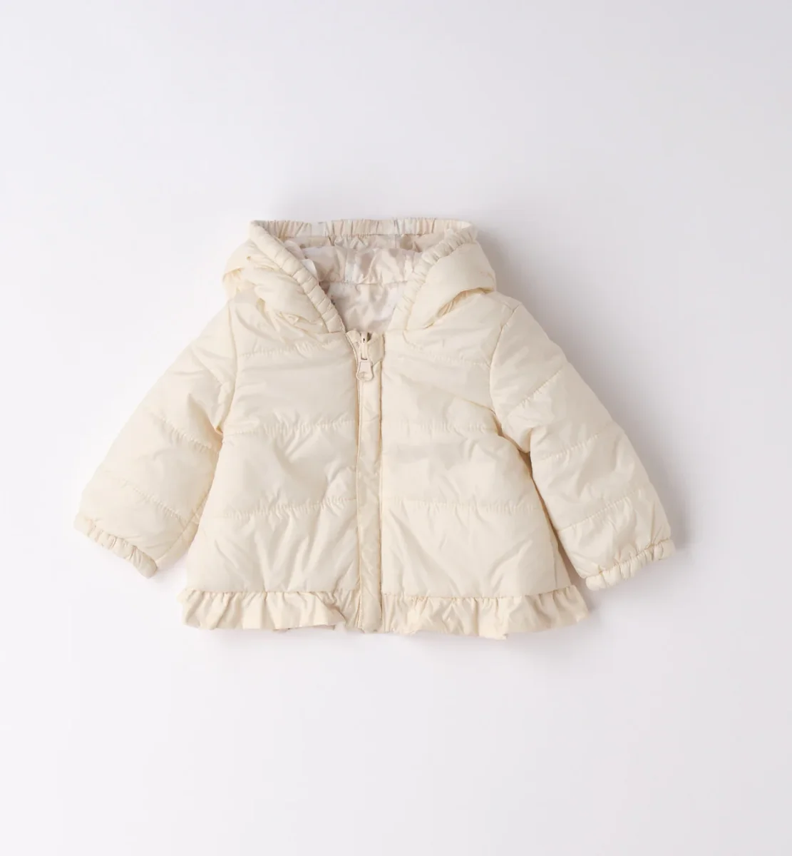 giubbino imbottito bambina panna con cappuccio e balza โ giacca invernale dal design delicato e raffinato, realizzata in tessuto imbottito leggero ma caldo, perfetta per proteggere nelle giornate piรน fresche. modello con zip frontale, cappuccio avvolgente e fondo arricchito da balza arricciata che dona un tocco elegante e femminile. vestibilitร comoda, ideale da abbinare ad abitini o completini per look curati e dolci, perfetta sia per il quotidiano che per occasioni speciali.