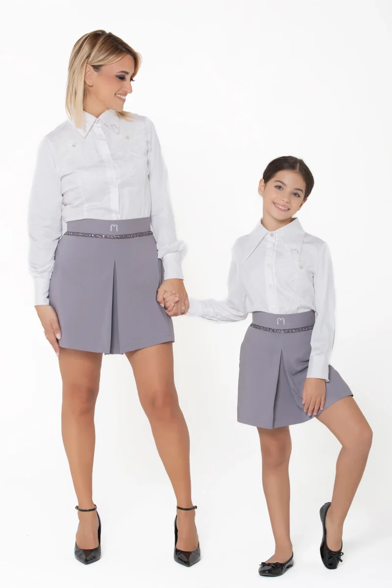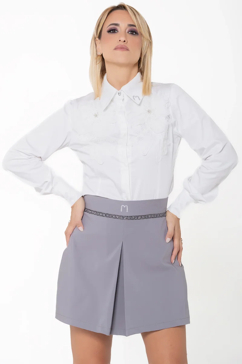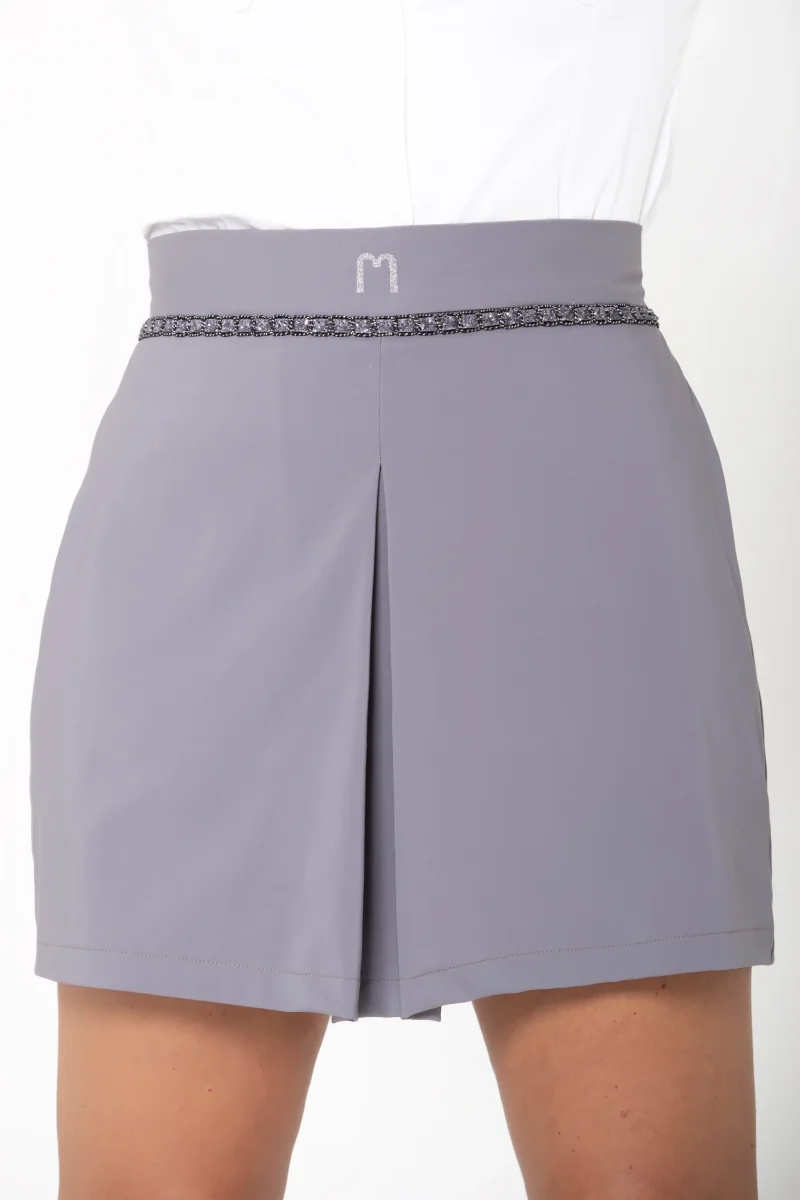 Uno short con pannello finta gonna in doppio cotone stretch con cinturino incorporato gioiello. M lurex argento.