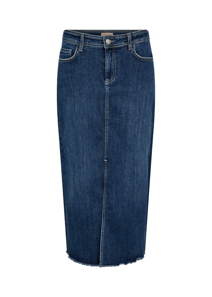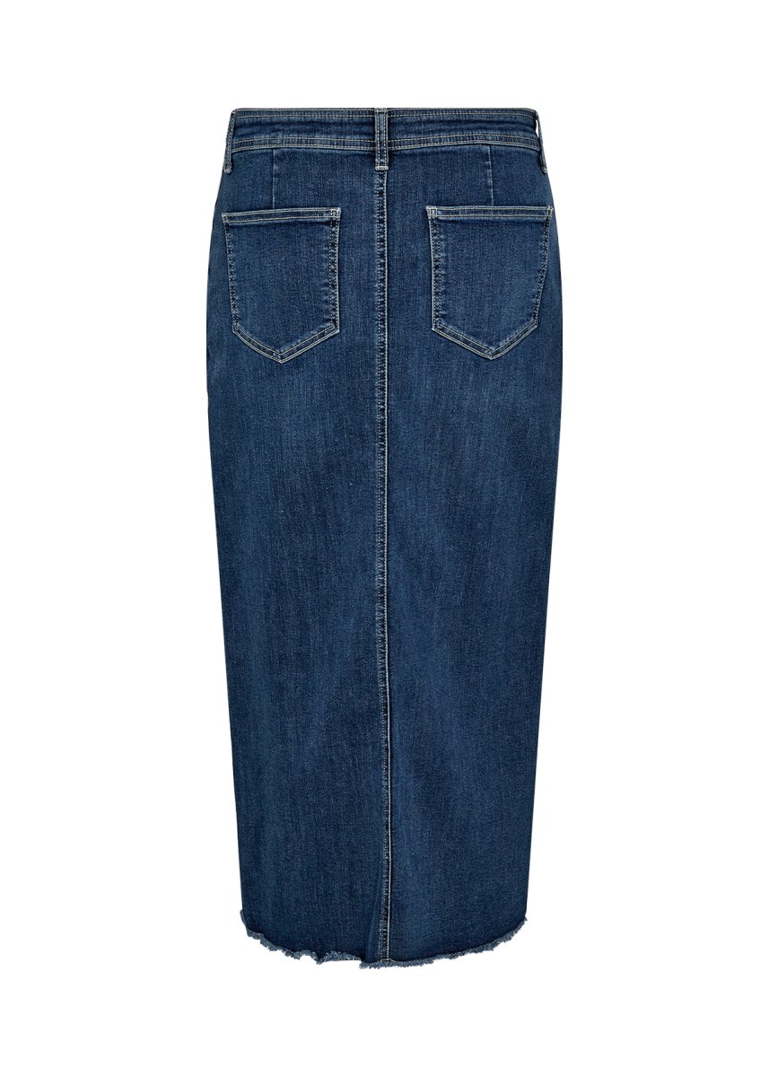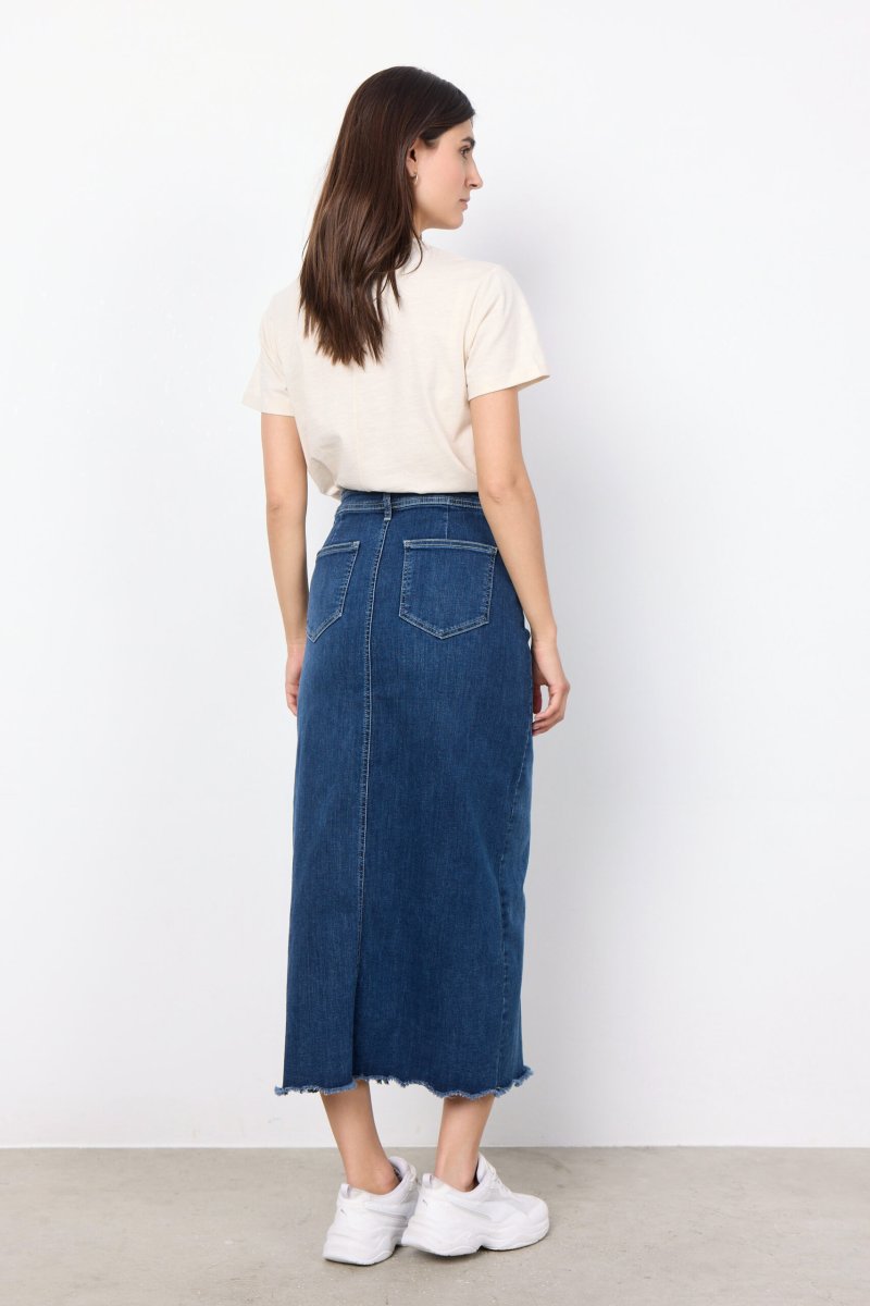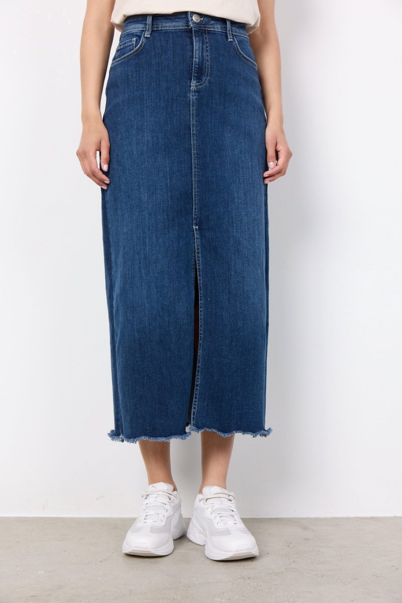 Parole chiave SEO: gonna in denim, gonna con spacco, gonna vita alta, gonna sostenibile, moda donna, moda casual, abbigliamento femminile, gonna blu tg comode, look estivo.