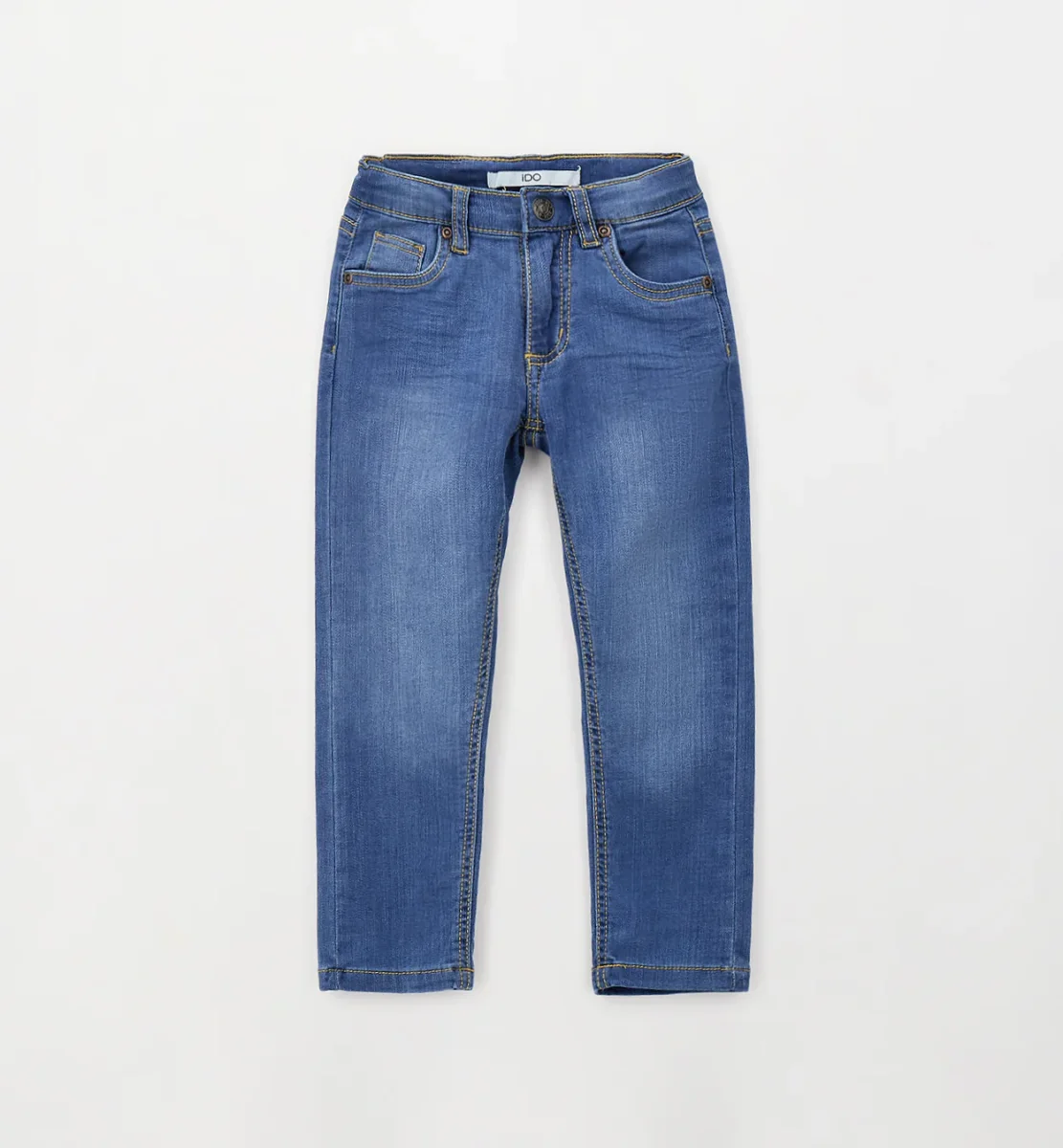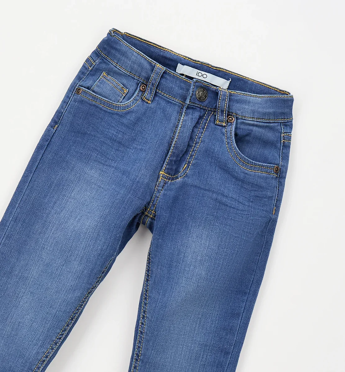jeans bambino blu denim lavaggio medio con tasche e cuciture a contrasto โ pantalone in denim elasticizzato dal lavaggio leggermente sfumato che dona profonditร al colore e un look autentico. modello cinque tasche con chiusura frontale a bottone e zip, passanti in vita e cuciture senape a contrasto che valorizzano la linea. vestibilitร confortevole ideale per lโuso quotidiano, perfetto da abbinare a t-shirt stampate o felpe sportive per outfit casual pratici e sempre attuali.