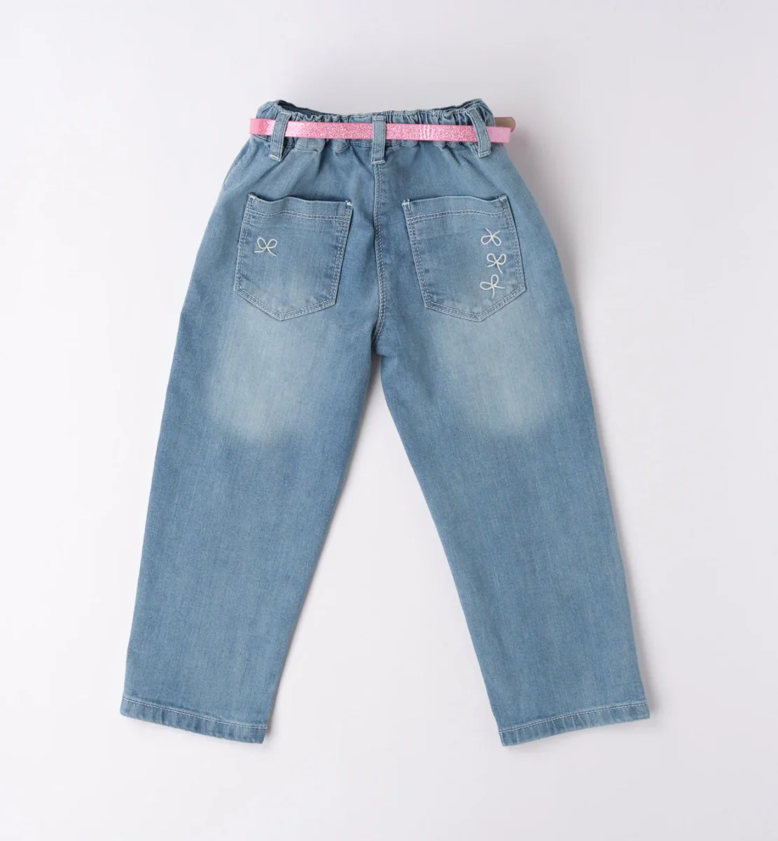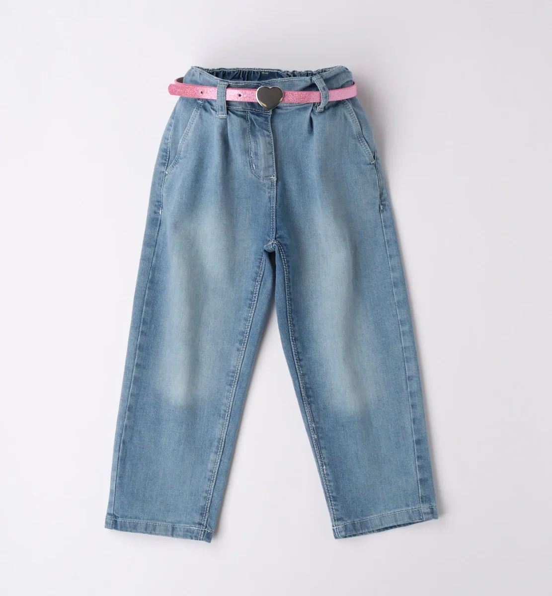 jeans bambina denim chiaro con cintura rosa โ pantalone in denim morbido lavaggio chiaro con elastico in vita e passanti, completato da cinturina rosa glitter con fibbia a cuore. modello dalla linea dritta con tasche ricamate sul retro, ideale per look casual femminili da abbinare a t-shirt o bluse leggere.