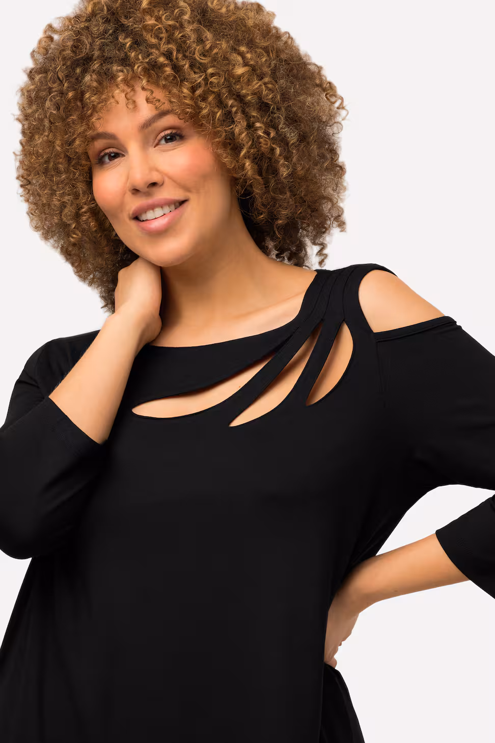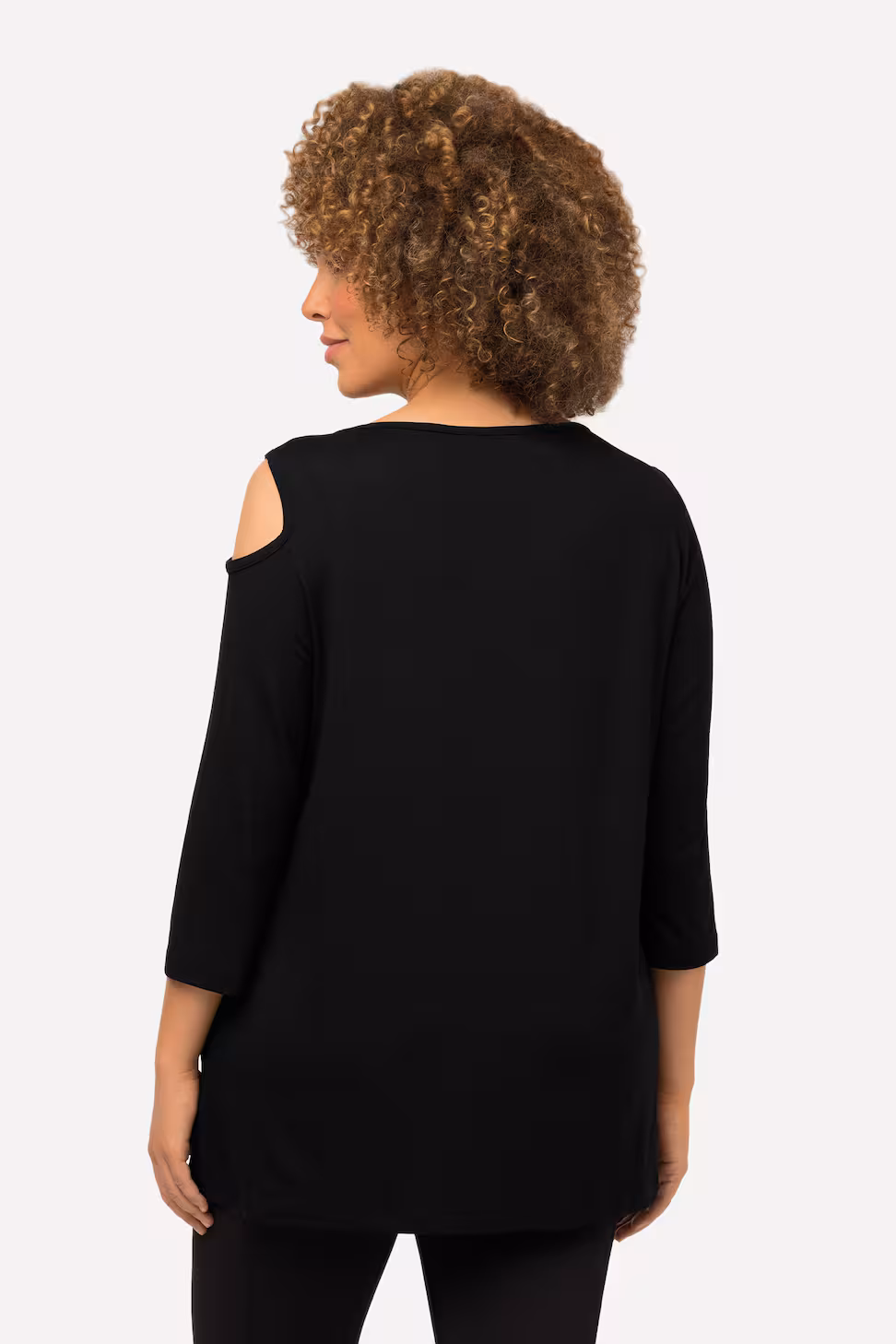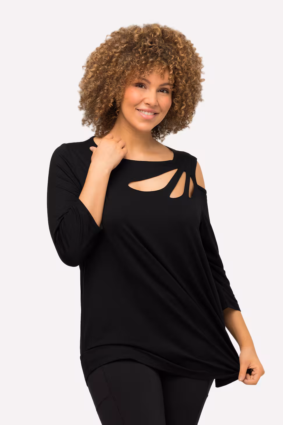 Maglia nera svasata con scollo a barca e taglio asimmetrico – Maniche 3/4
