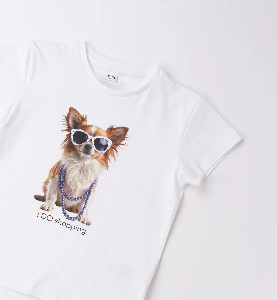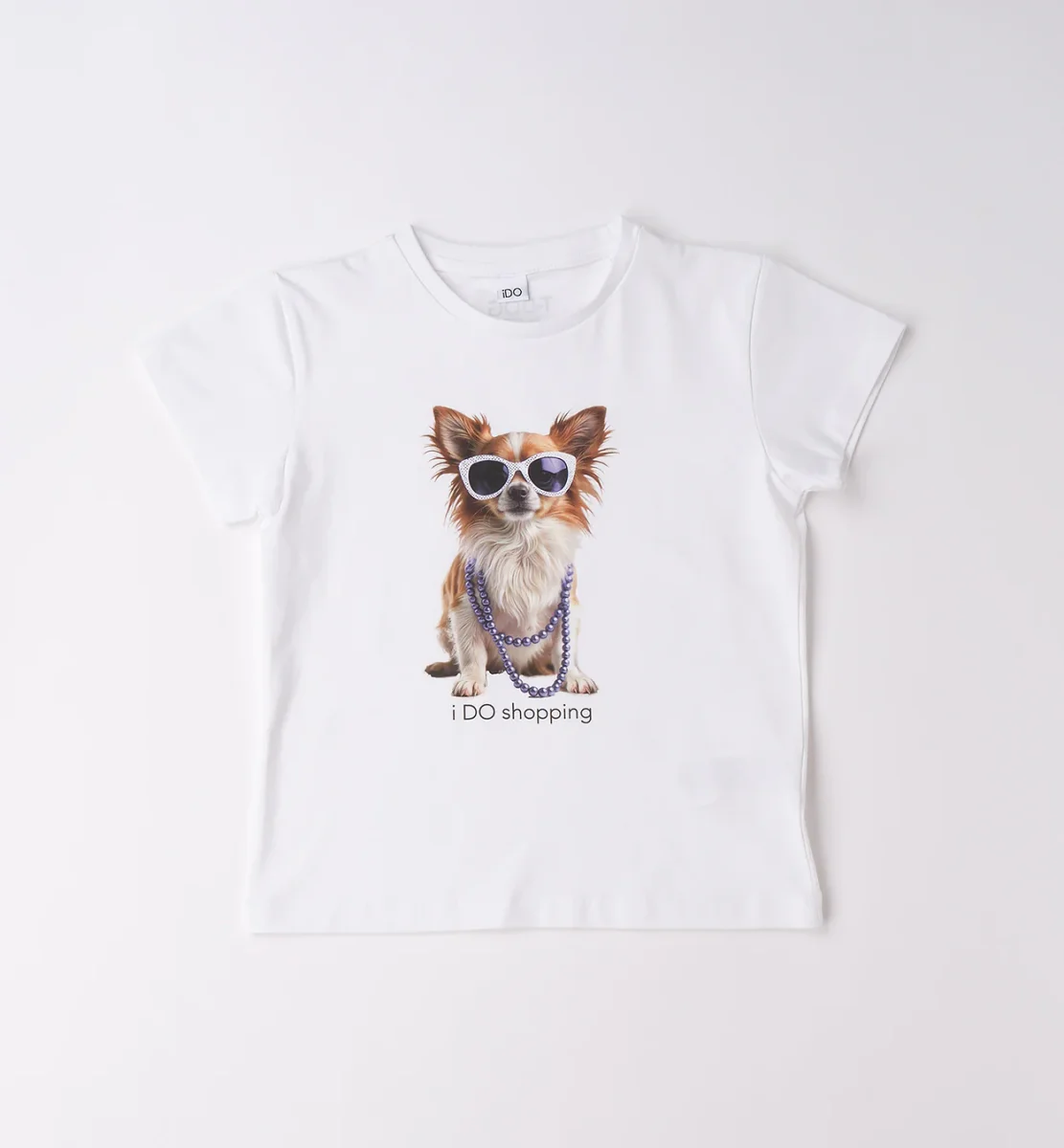 maglietta manica corta bambina/ragazza bianca con stampa cagnolino fashion โ t-shirt in morbido cotone dalla vestibilitร comoda con grafica centrale simpatica e super di tendenza, raffigurante cagnolino con occhiali da sole e collana, accompagnato da scritta โi DO shoppingโ. modello girocollo classico con maniche corte, perfetto per creare outfit estivi freschi e divertenti. ideale da abbinare a leggings, shorts o jeans per look casual dallo stile giocoso e moderno.