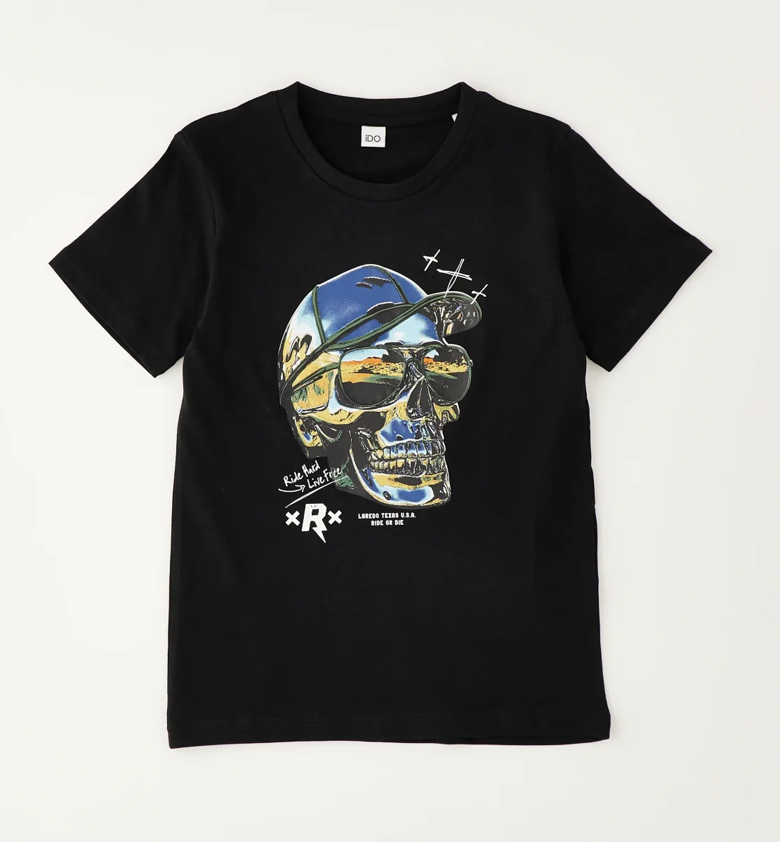 maglietta ragazzo nera con stampa teschio multicolor โ t-shirt a manica corta in morbido cotone tinta unita, caratterizzata da stampa frontale con teschio effetto grafico multicolor con cappellino e occhiali, per uno stile deciso e contemporaneo. modello con girocollo classico e vestibilitร comoda, ideale da abbinare a jeans, bermuda o jogger per creare outfit casual e di carattere perfetti per il tempo libero.