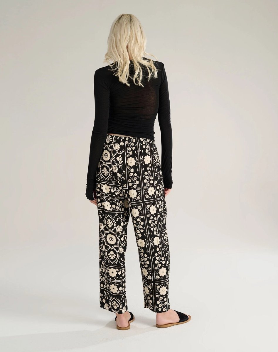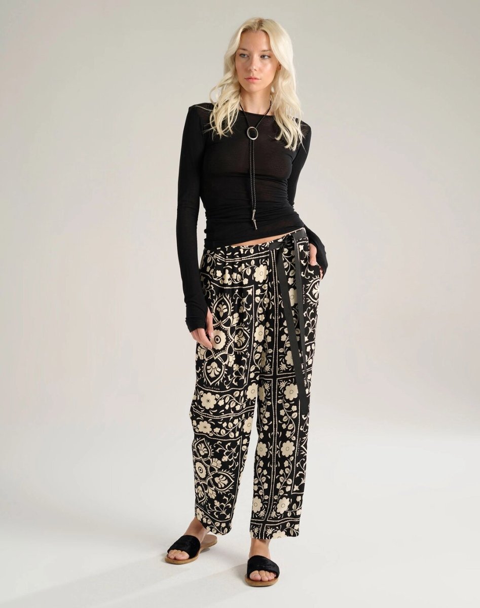Pantalone mom-fit realizzato in cotone popeline con vita bassa. La particolsritร del bustino accavallato con pieghe, lo rendo un capo unico e contemporaneo. L’abbottonatura รจ asimmetrica e regolabile mediante una fusciacca posta al fianco destro.