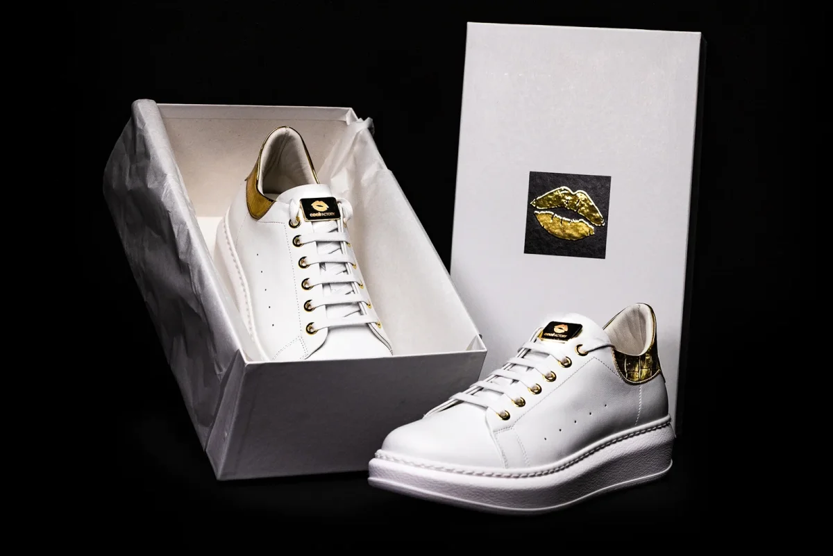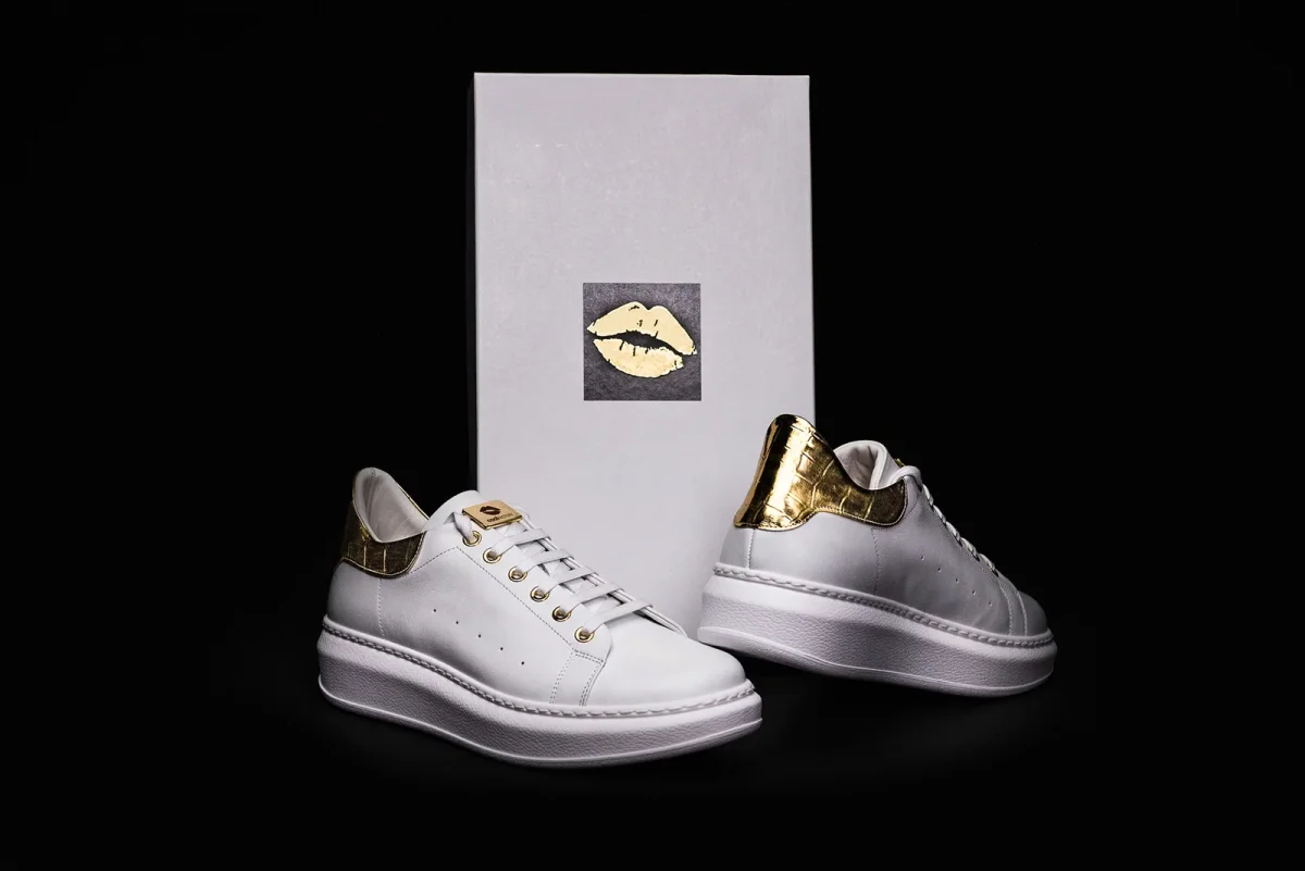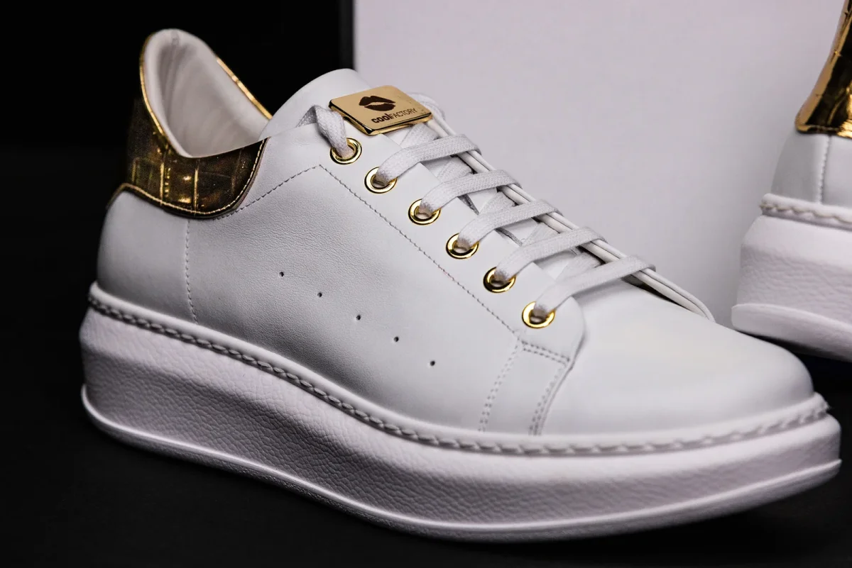 Sneakers bianche in vitello liscio lucido con lacci, punta oversize rotonda in gomma e dettagli oro stampa coccodrillo sulla parte posteriore. Finitura traforata sulla parte esterna della scarpa. Interno foderato in capretto fori in metallo oro lucido specchio. Lacci piatti e targhetta in metallo dorato con logo โcoolfactoryโ sulla linguetta. Suola oversize in gomma.