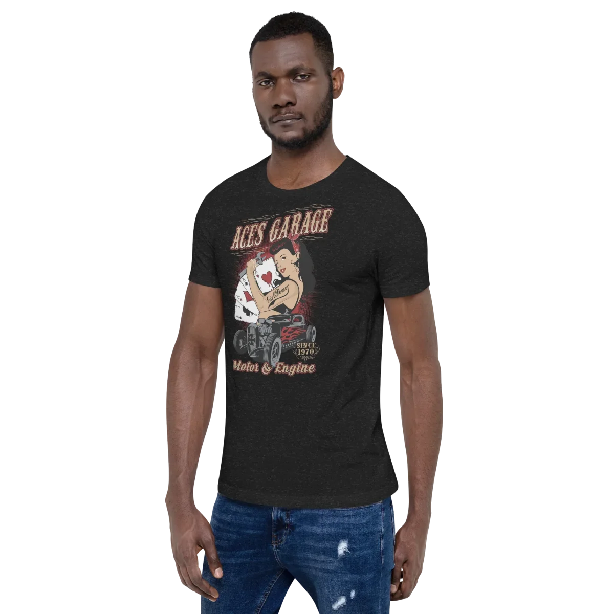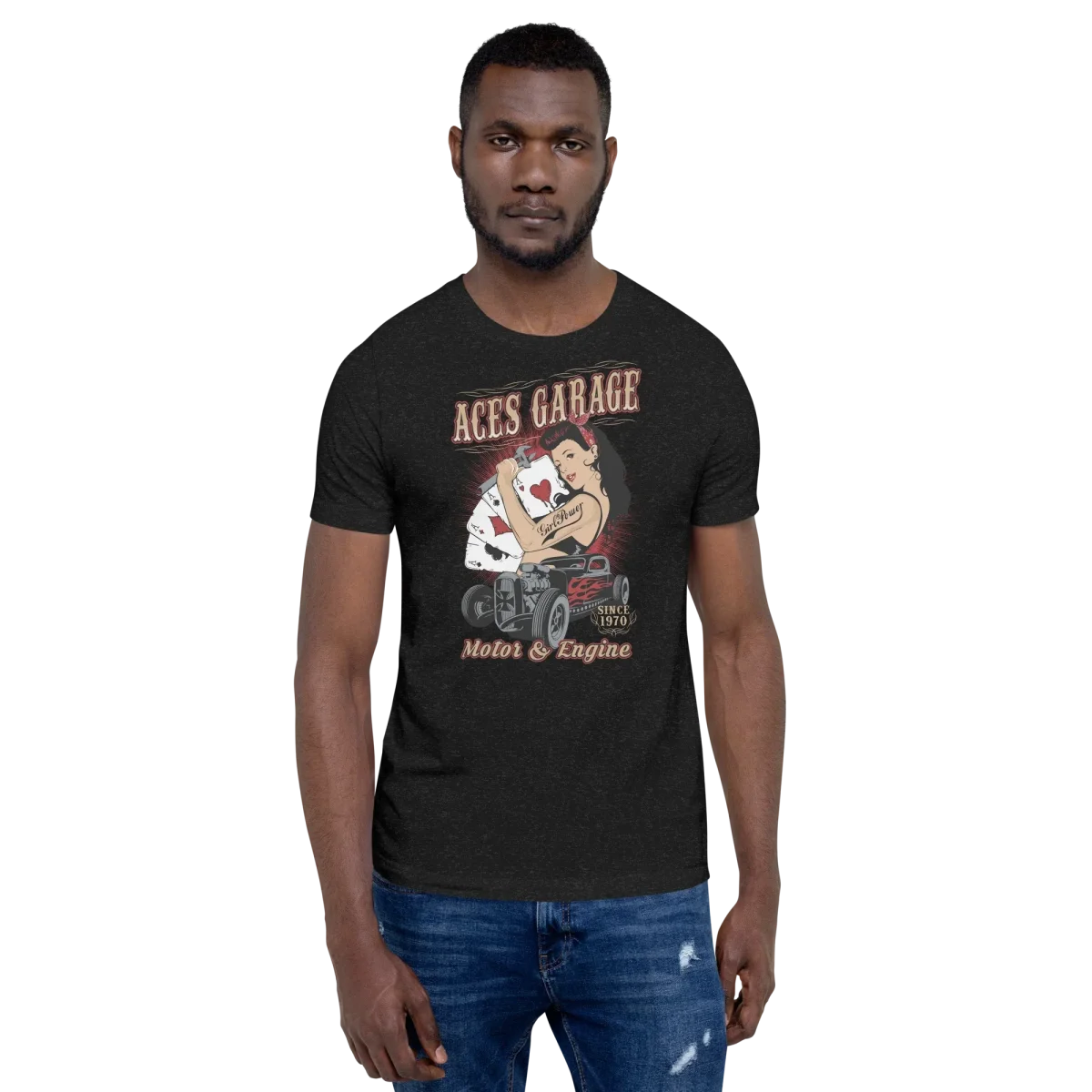 Esprimi la tua passione per i motori con la nostra T-shirt “Aces Garage”. Questa maglietta รจ perfetta per chi ama distinguersi e mostrare un look dal carattere unico. Realizzata con materiali di alta qualitร , garantisce comfort e durata anche negli usi piรน intensi, soprattutto per chi apprezza lo stile motori garage hot road.