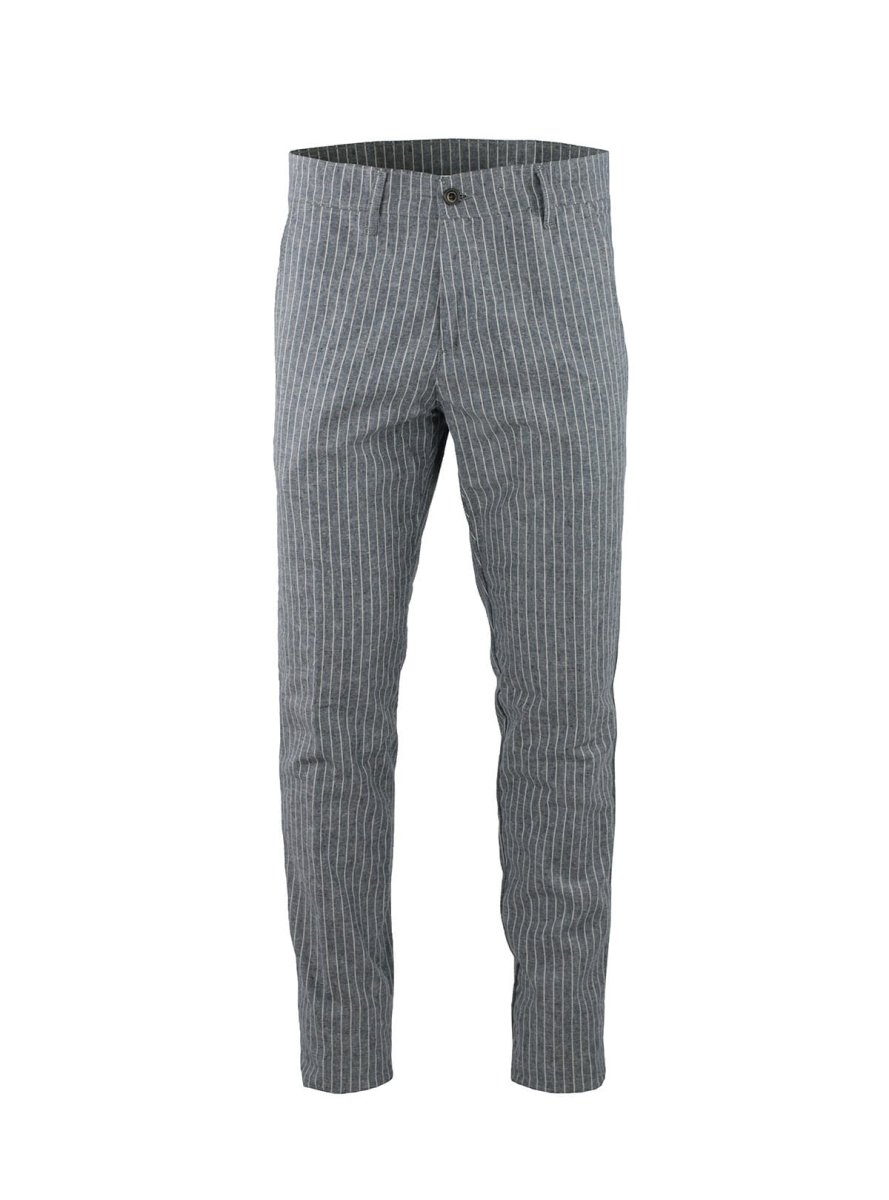 L’eleganza del tessuto gessato e la comoditร del pantalone chino si uniscono armoniosamente negli accattivanti pantaloni in misto lino, perfetto per i tuoi look estivi. Slim Fit.