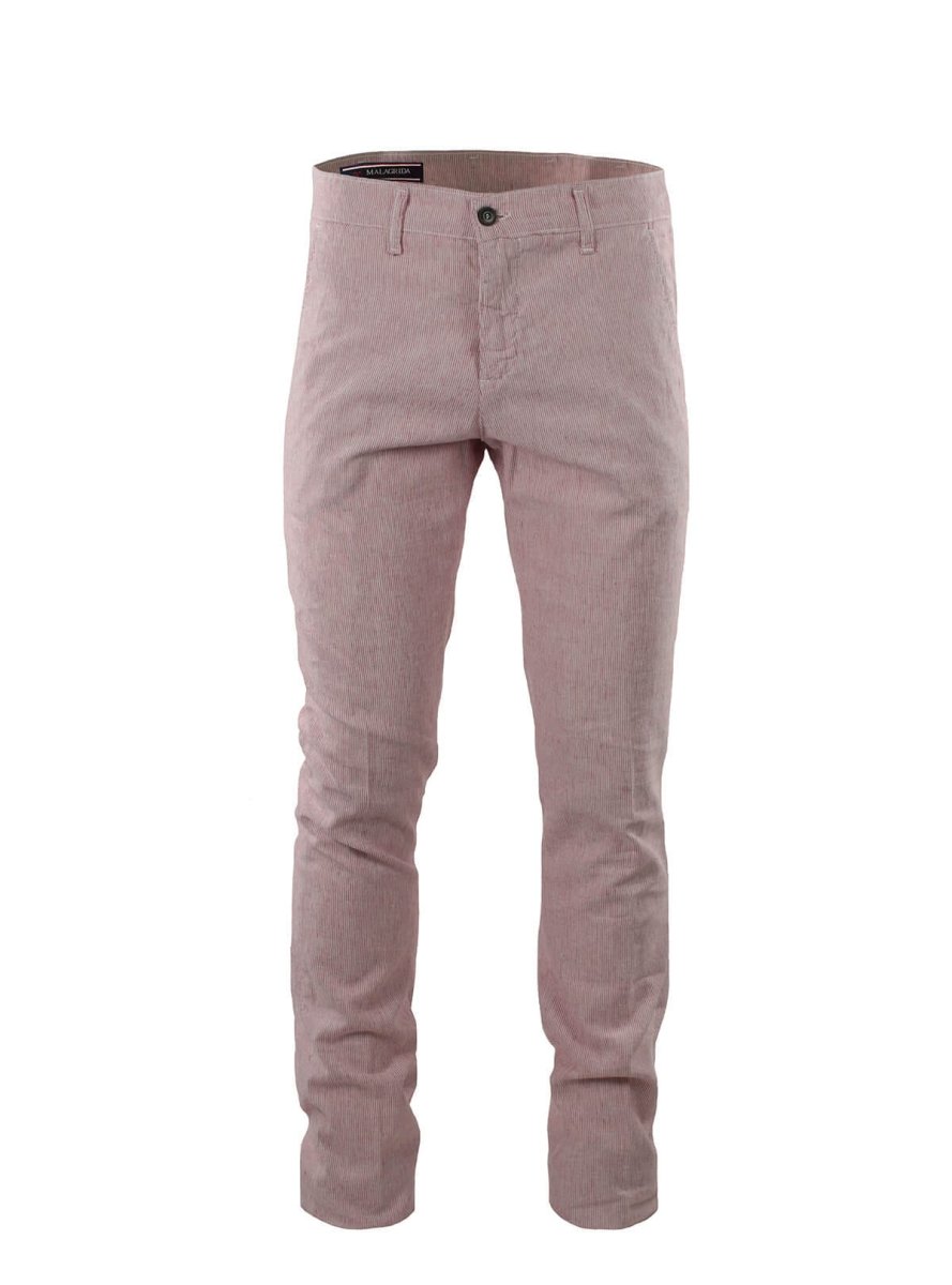 Scegli il pantalone realizzato in cotone lino a piccole righe verticali. MADE IN ITALY. Vestibilitร Slim.